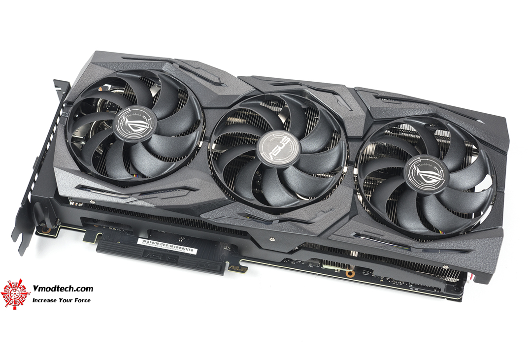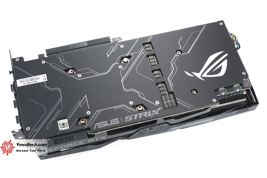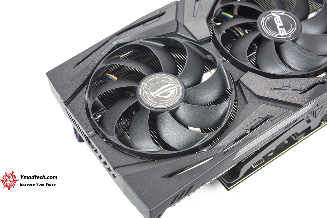 สันการ์ดนั้นจะมีโลโก้ซีรีย์ GeForce RTX และ Republic of Gamers ด้านบน ซึ่งตรงโลโก้ ROG ด้านท้ายจะมีไฟเรืองแสงลอดมาด้วยนะ ตัวการ์ดจะต้องการไฟเลี้ยงจากขั้วแบบ PCIe 8 พินจำนวนสองหัวครับ