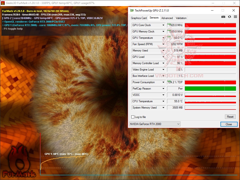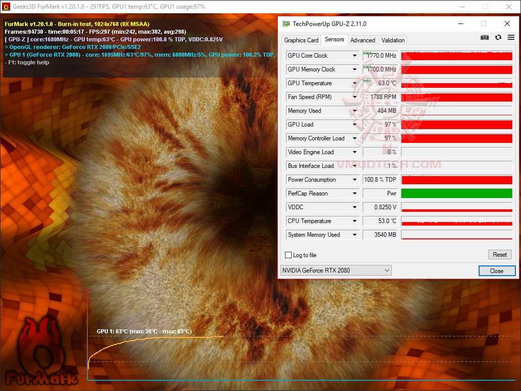 ความร้อนนั้นสูงสุดอยู่ที่ไม่เกิน 65 องศาเซลเซียสนอกเคสโดยที่รอบพัดลมทำงานตามโพรไฟล์ของการ์ด เสียงรบกวนนั้นเบามากเรียกว่าแทบไม่ได้ยินเลย