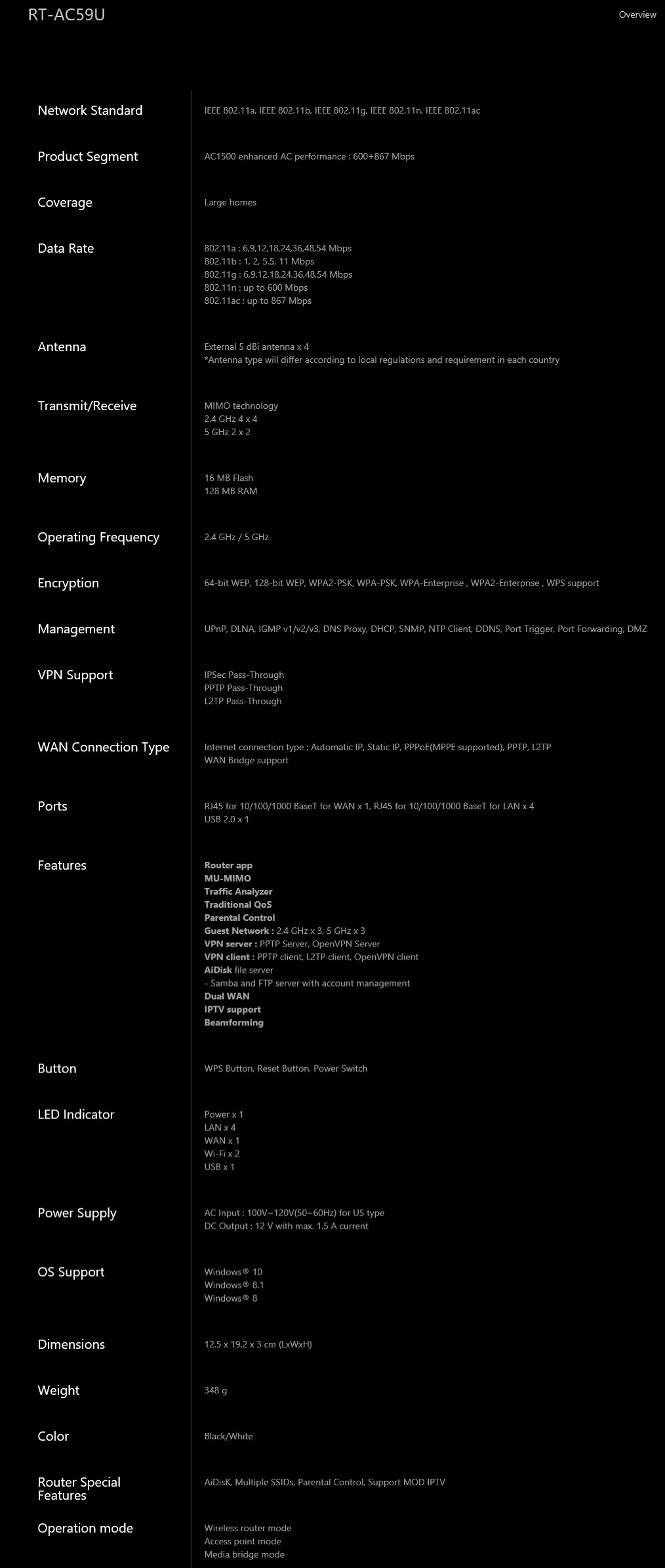 ASUS RT AC-59Uนั้นเป็น Wireless Dual-Band ที่รองรับการเชื่อมต่อสูงสุดที่ 802.11ac สองย่านความถี่คือ 2.4 GHz ได้สูงสุด 600 Mbps และ 5 GHz สูงสุดที่ 867 Mbps ตัว ได้ติดตั้ง Flash ขนาด 16 เมกกะไบท์ และมี Ram 128 เมกกะไบท์ ดูจากสเปกพื้นฐานแล้วก็น่าจะพอใช้งานได้กับบ้านหลังใหญ่ๆเลยครับ