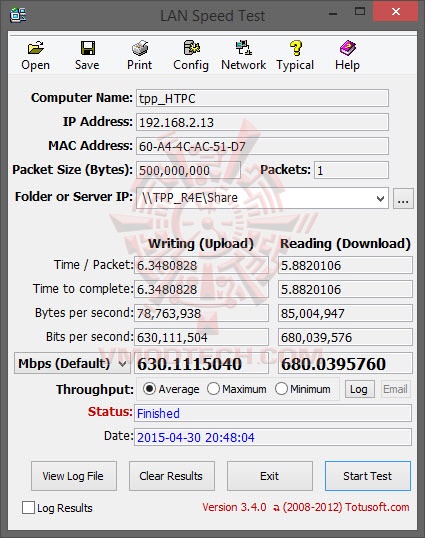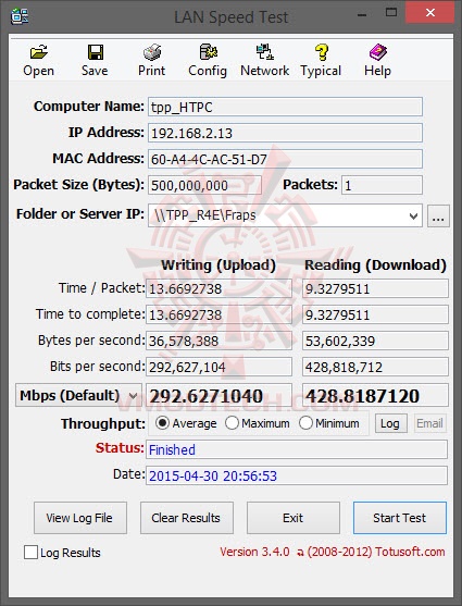 ในการทดสอบ RT-AC3200 นั้นกระทำโดยทดสอบโดยโปรแกรม LAN speed test จาก Laptop ไปยังคอมพิวเตอร์ที่ใช้เป็นเซอร์เวอร์ผ่านทางความถี่ 5 GHz อีกช่องนึงจะเป็นจาก Desktop ที่อยู่ห่างไปอีกห้องและทำการเชื่อมต่อโดย RT-EA87 บนโหมด Media Bridge ผ่านทาง 5 GHz อีกย่าน