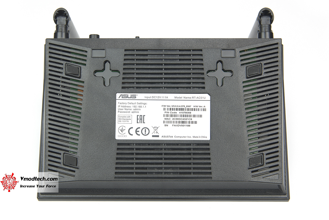 หงายด้านล่างของ ASUS RT-AC51U ก็จะเห็นการออกแบบให้ตัวถังนั้นถูกยกขึ้นและเจาะรูพรุนช่วยระบายความร้อน