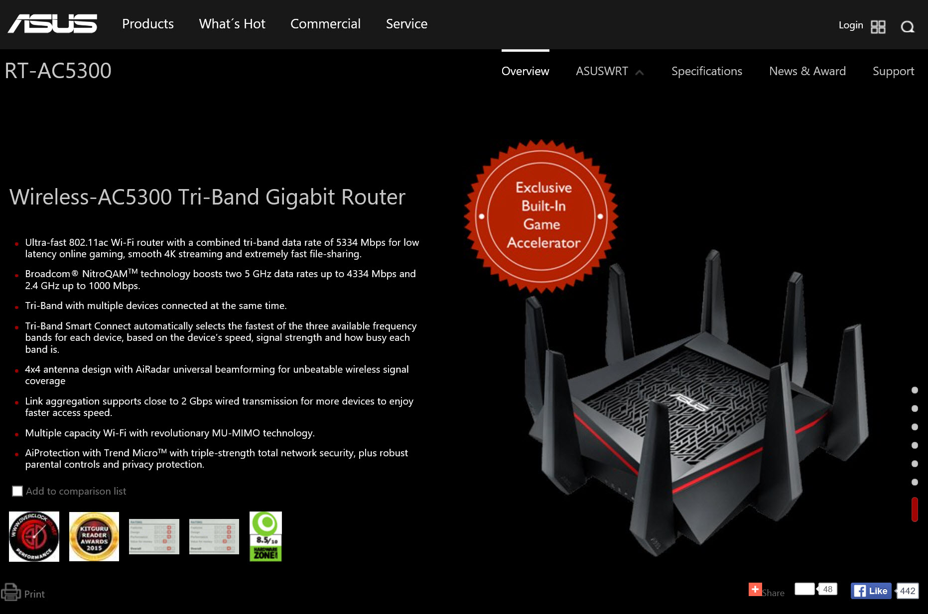 สวัสดีครับ วันนี้มี Router รุ่นใหญ่ประสิทธิภาพสูงมารีวิวให้ได้ชมกันอีกเช่นเคย ASUS RT-AC5300 นั้นเป็น Tri Band Wireless Router คลาส AC5300 กระจายสัญญาณผ่านทางความถี่ 5.0GHz ได้สองย่าน และ 2.4 GHz ได้อีกหนึ่งย่านครับ ตัว Processes ควบคุมนั้นได้ทำการติดตั้ง 1.4 GHz dual-core processor เพิ่อช่วยยกระดับประสิทธิภาพของการเขียน/อ่าน USB และความเร็วของ WAN/LAN โดยจุดเด่นอีกจุดนั้นคือ GAMING BOOST ที่จะช่วยบริหารแบนด์วิทท์ทำให้ Latency นั้นลดลงด้วย ทั้งหลายทั้งมวลนี้บอกด้วยสเปกนั้นเราอาจจะไม่เข้าใจถึงประสิทธิภาพของมันเท่าไหร่นักคงต้องติดตามว่าผลการเทสนั้นจะแรงขนาดไหนครับ