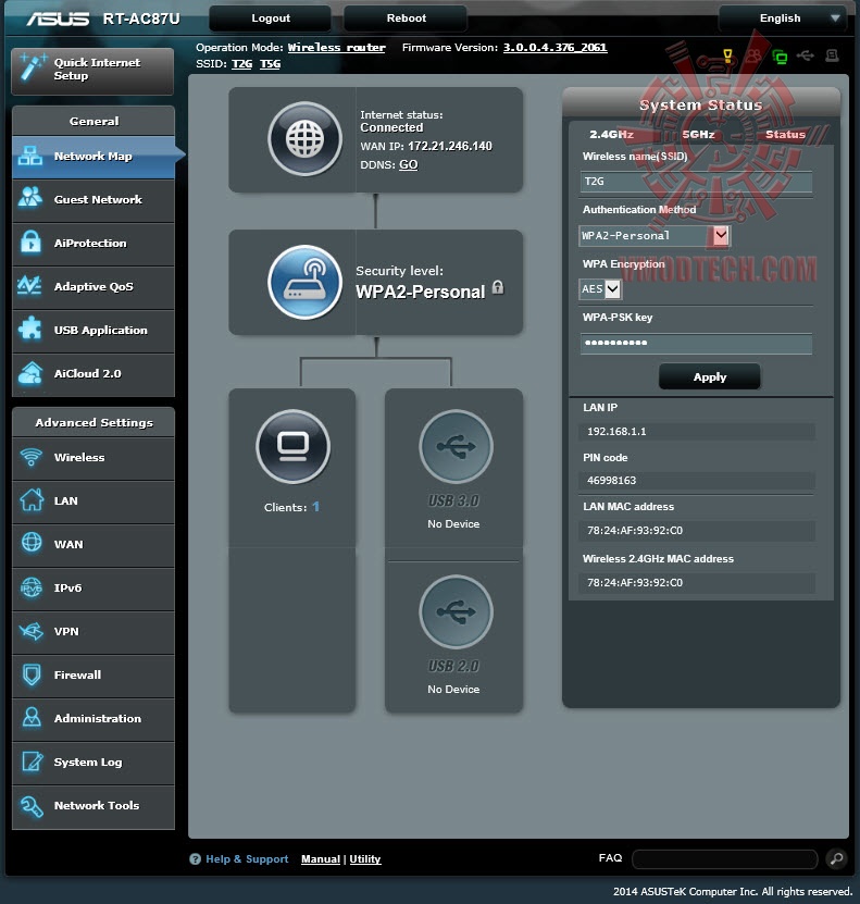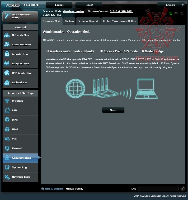 หน้านี้เป็นส่วนของ Admin ครับ อย่างที่ทราบว่า Wireless Router นั้นสามารถปรับแต่งตัวมันเองให้เป็น Wireless Router Mode หรือ Access Point หรือ จะเป็นเพียงแค่ Media Bridge ทำหน้าที่เฉพาะด้านความพันเทิง อันนี้ก็ขึ้นอยู่กับลักษณะการใช้งานครับว่าเราตั้งค่าการใช้งานแบบไหน ถ้าสเกลเล็กๆอย่างใช้ตามบ้านนี่ ผมว่า AC87U เอาอยู่ทุกสถานการณ์