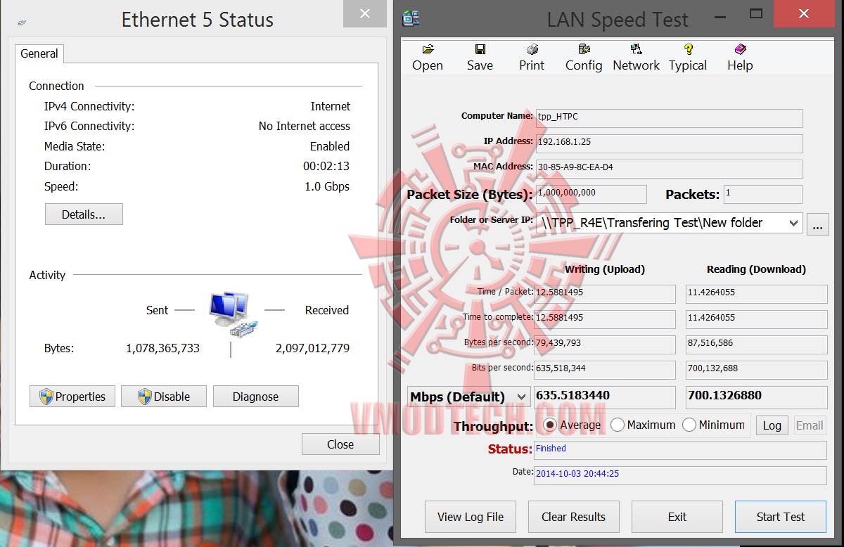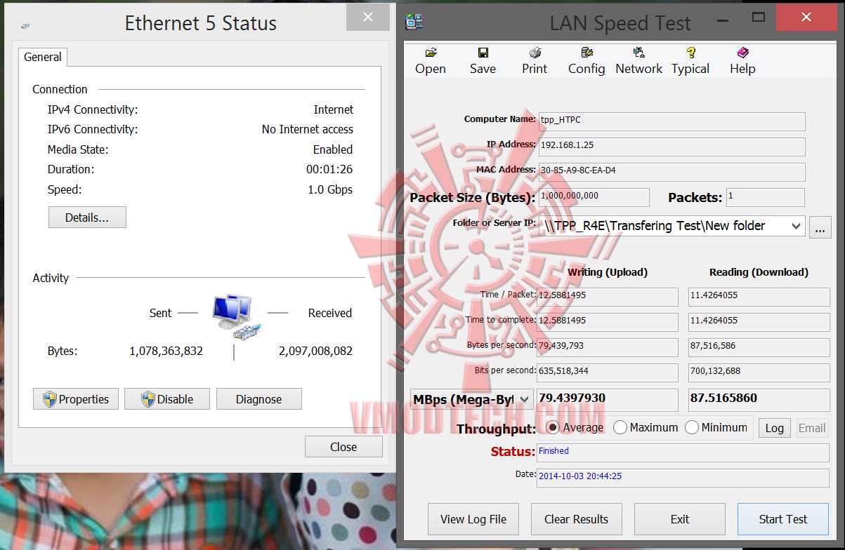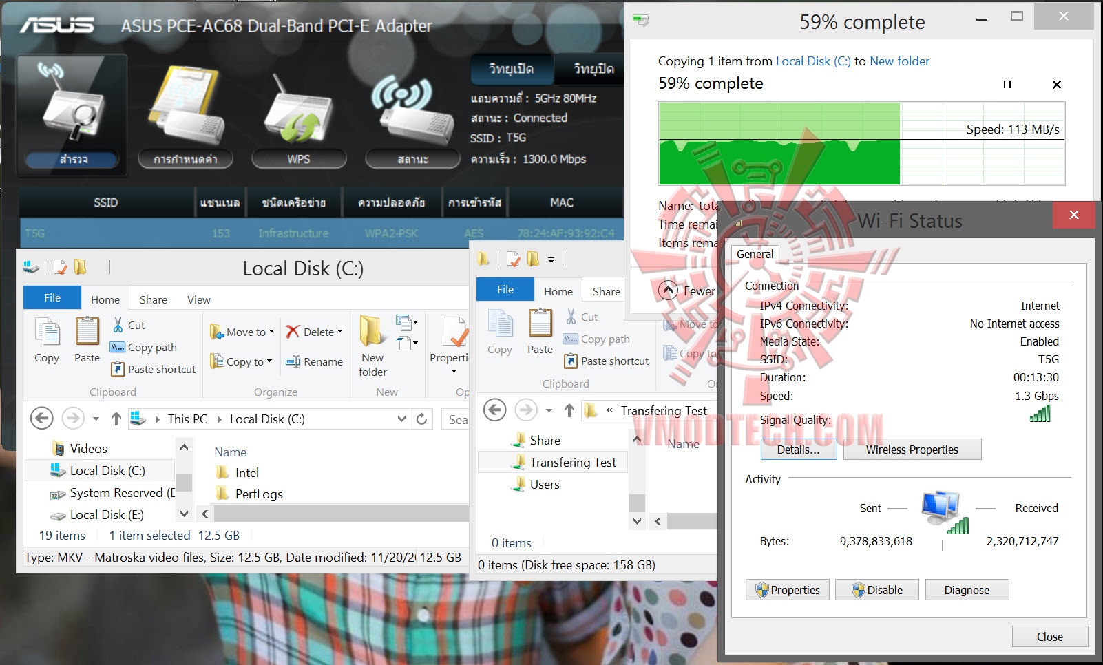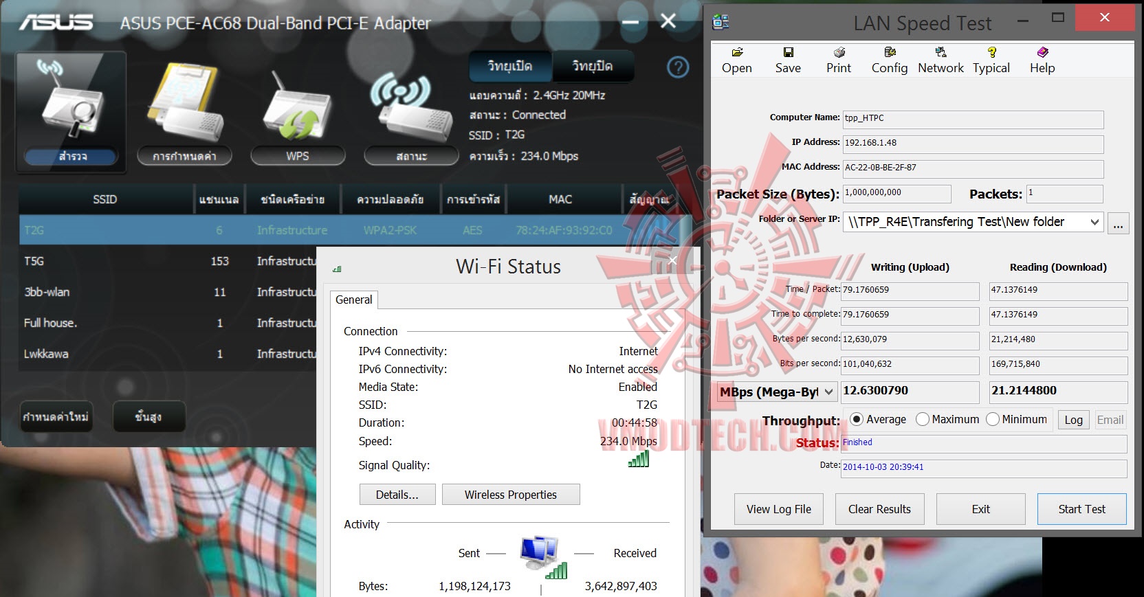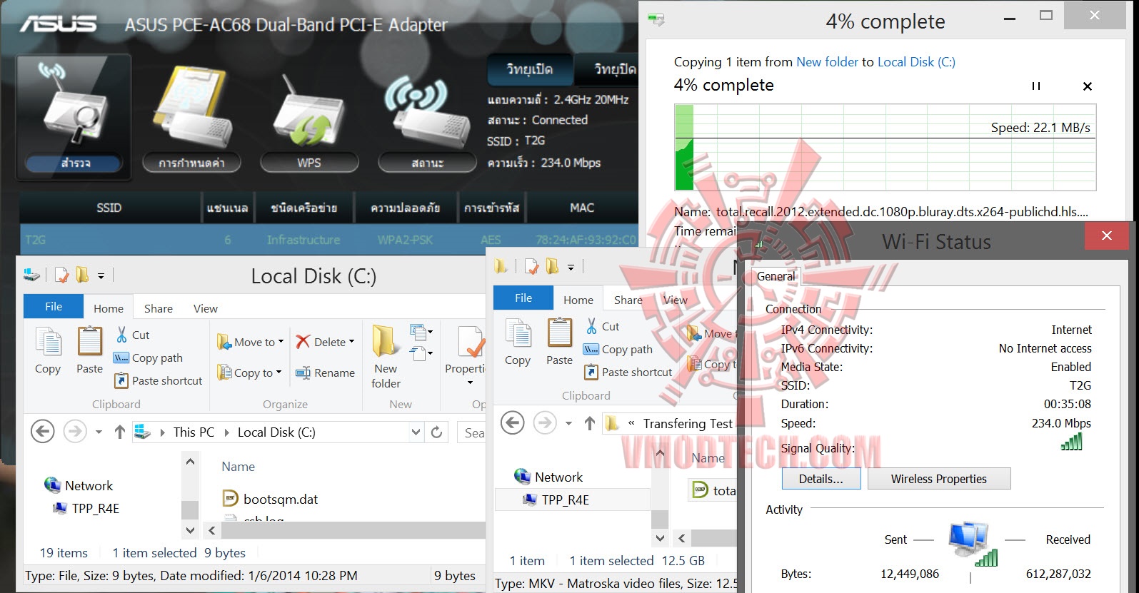 ทางด้าน PCE-AC 68 นั้นได้ถูกติดตั้งกับคอมพิวเตอร์ Client ครับ โดยที่วันนี้เราจะทำการทดสอบการเชื่อมต่อและส่งถ่ายข้อมูลจากเครื่อง Client ไปยังคอมพิวเตอร์อีกเครื่องนึงที่อยู่ในวงแลนเดียวกัน ระยะห่างระหว่างคอมพิวเตอร์สองเครื่องนี้จะอยู่ที่ประมาณ 5 เมตรและมีกำแพงขวางหนึ่งชั้น คอมพิวเตอร์ที่เป็น client นั้นเป็น motherboard ASUS Maximus V ที่ติดตั้ง Core i7 2600K และใช้งาน Plextor M6Pro 256GB ส่วนคอมอีกเครื่องเป็น MSI X99s XPOWER AC ที่ติดตั้ง Core i7 5960X และ Plextor M6Pro 1TB โดยการเคลื่อนย้ายไฟล์ทั้งหมดทำระหว่าง SSD ถึง SSD ครับ