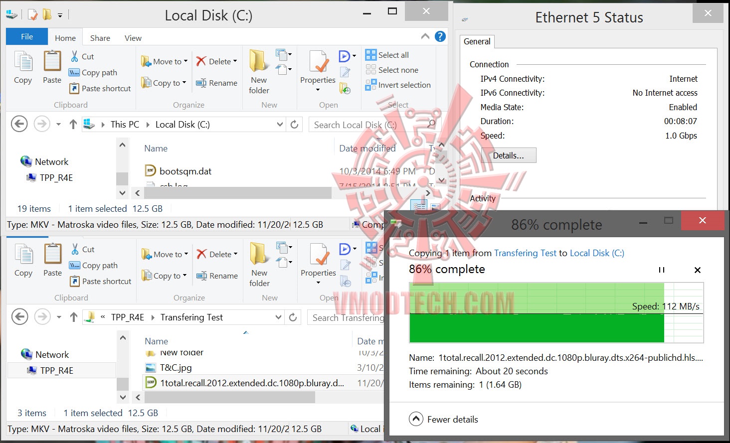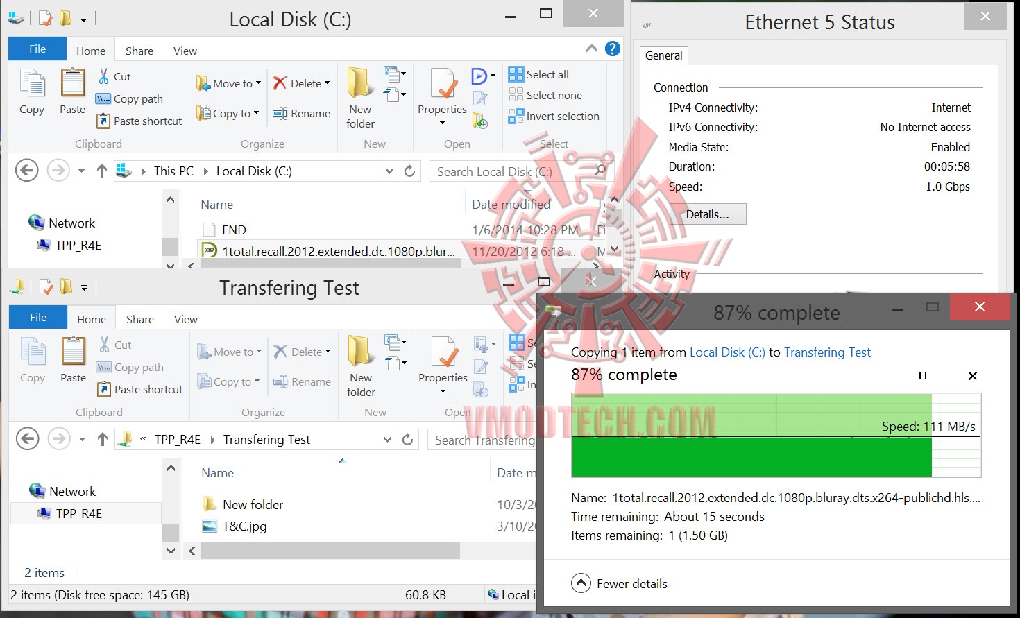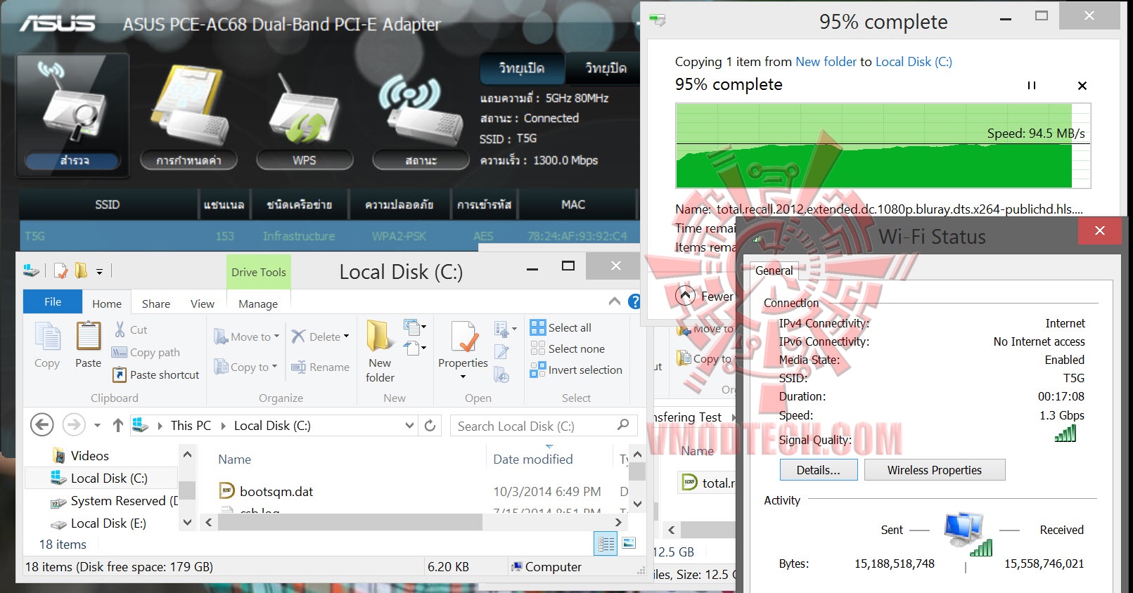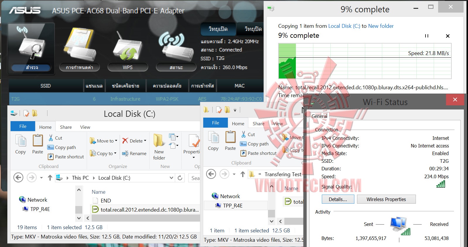 ผมลองโยนไฟล์จาก Client ไปยัง Server ครับ ที่ย่านความถี่ 2.4 GHz นั้นผลงานไม่ค่อยดีเท่าไหร่นักหากจะพึงพาเอาไว้เล่นหนังไฟล์ใหญ่ๆแบบนี้