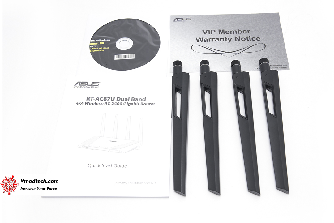 สิ่งที่แถมมากับกล่องเซตแรกก็จะเป็นแผ่น CD Driver คู่มือแผ่นพับ และที่เห็นสี่เสาด้านบนนั่นก็คือเสากระจายสัญญาณสี่ต้นที่ได้ถูกออกแบบมาพร้อมกับ AC87U ที่ถือเป็น Router รุ่นแรกที่ออกแบบการกระจายสัญญาณแบบ 4×4 MU-MIMO และประกอบกับเทคโนโลยี Beamforming ที่จะช่วยส่งสัญญาณอย่างชาญฉลาดไปยังอุปกรณ์ไร้สายต่างๆได้อย่างเต็มที่ ครอบคลุมพื้นที่ประมาณ 5000 ตารางฟุต หรือประมาณ 465 ตารางเมตร