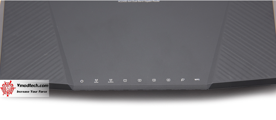 ไฟแสดงผลด้านหน้าซึ่งจะอยู่บริเวณใต้สัญลักษณ์นี้ เรียงจากซ้ายไปขวา ไฟแสดงผลของการเปิด/ปิด Router, สัญญาณ Wifi 5GHz, สัญญาณ Wifi 2.4GHz, ตามด้วยไฟสัญญาณการต่อเชื่อมพอร์ทแลนแบบกิ๊กกาบิทสี่ช่องด้านหลัง ไฟแสดงสัญญาณอินเตอร์เนตเข้าและสุดท้ายขวาสุดคือไฟแสดงสัญลักษณ์การต่อเชื่อมกับอุปกรณ์อื่นด้วยวิธี WPS
