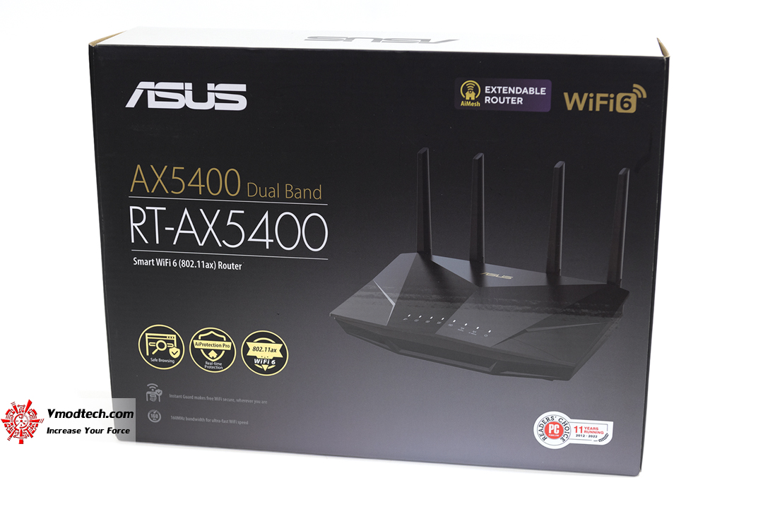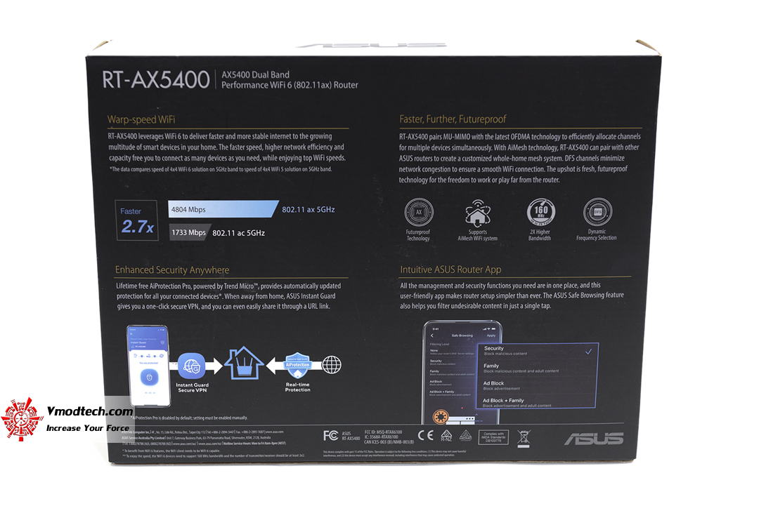 กล่องบรรจุ RT-AX5400 นั้นมีขนาดปานกลาง ที่ด้านหลังกล่องนั้นมีรายละเอียดของตัวเราเตอร์แสดงไว้อย่างชัดเจน
