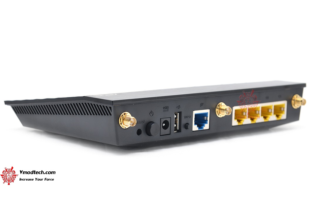 บริเวณเชื่อมต่อด้านท้ายของ Router ASUS RT-N14UHP ที่เห็นเป็นสีทองนั้นคือจุดที่จะนำเอาเสาทั้งสามต้นมาเสียบเข้าไปครับ ถัดไปจะเป็นปุ่มรีเซต ปุ่ม power ช่องเสียบไฟจาก adapter พอร์ทเชื่อมต่อ USB flash Drive 2.0/Printer ถัดไปจะเป็นปุ่ม WPS เอาไว้เชื่อมต่อกับอุปกรณ์ต่างๆที่รองรับการต่อเชื่อม WPS พอร์ท แลนที่รับสัญญาณอินเตอร์เนตจากโมเดม และที่เรียงกันด้านขวามือสีเหลือคือพอร์ทแลนแบบ 10/100 Mbit/s