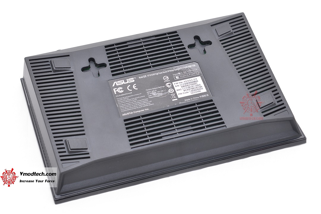 ด้านใต้ของ Router ครับ เราสามารถนำเอา Router ASUS RT-N14UHP ไปแขวนที่ผนังได้ด้วยเช่นกัน จะเห็นรูระบายอากาศกระจายอยู่ที่ด้านใต้นี้ด้วย