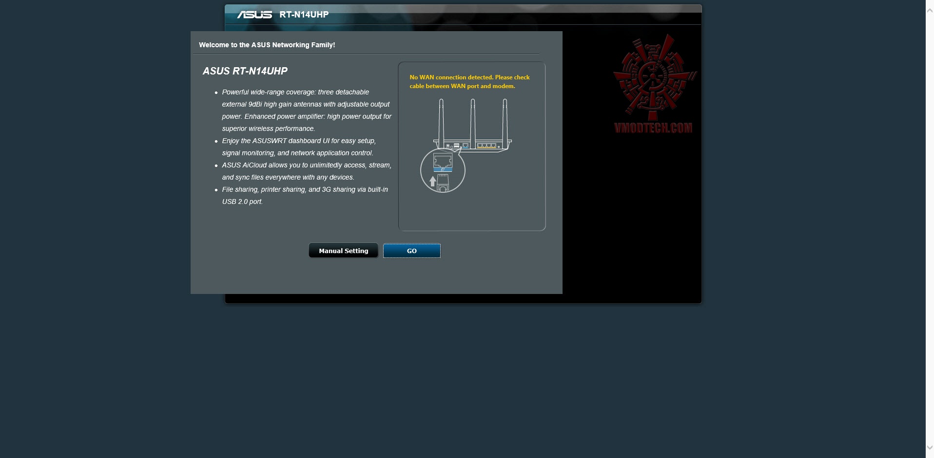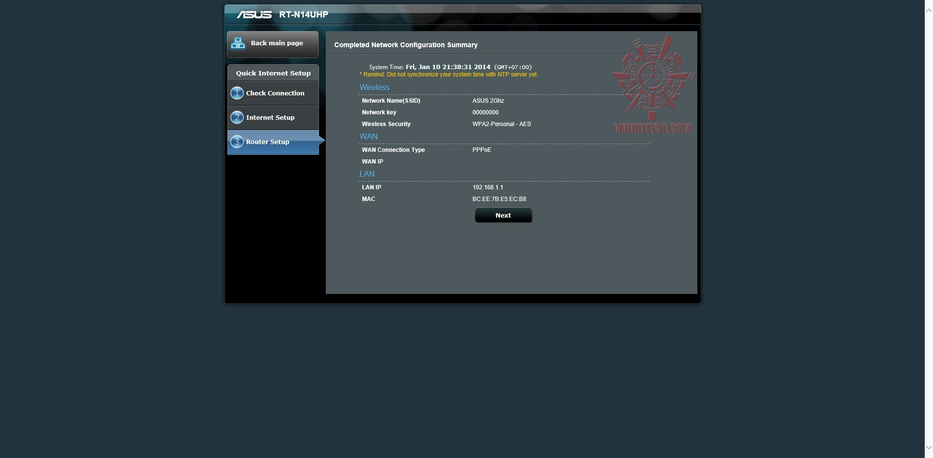 อย่างที่ได้กล่าวไปแล้วว่า ASUS RT-N14UHP นั้นเป็น Router เราต้องมี Modem ที่ได้ทำการเชื่อมต่อกับ Internet เอาไว้แล้วด้วยนะครับ และเมื่อเราทำการเชื่อมต่อ Router เข้าไปในระบบแล้ว Internet Browser ก็จะเด้งขึ้นมาแบบนี้เพื่อเข้าสู่การตั้งค่าแบบง่ายๆให้คนที่ไม่ชำนาญสามารถตั้งค่าต่างๆ