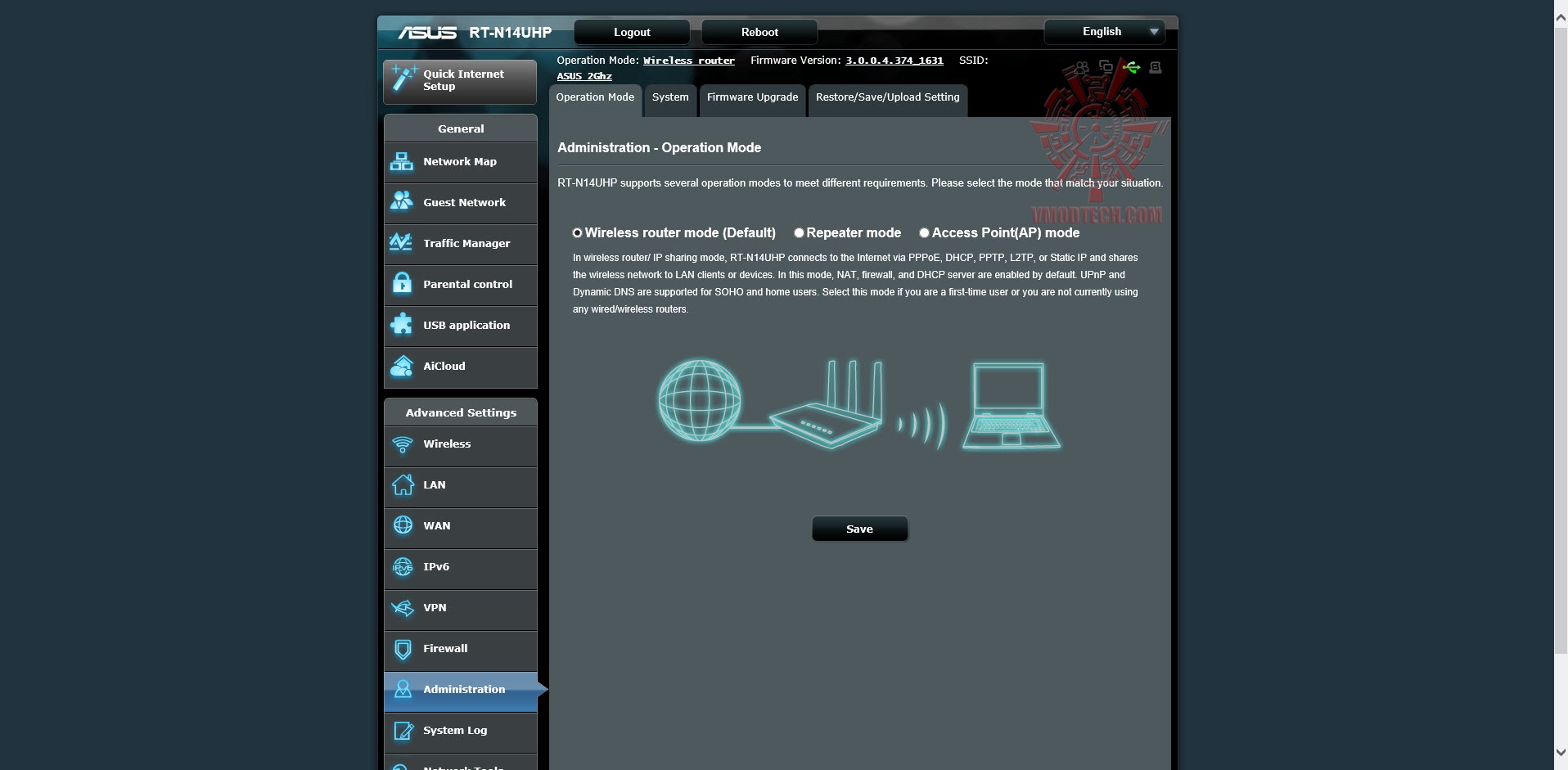 Operation Mode ของ Router ASUS RT-N14UHP ครับ ซึ่งมันสามารถทำหน้าที่ได้สามฟังก์ชั่นด้วยกันคือ Wireless router คือนำ Router ASUS RT-N14UHP ไปเชื่อมต่อกับ Modem เพื่อใช้งานอินเตอร์เนต Repeater mode โหมดนี้จะเป็นการทวนสัญญาณในกรณีที่พิ้นที่ที่เราต้องการใช้งานนั้นกว้างมากๆ Router ASUS RT-N14UHP สามารถใช้เพื่อเพิ่มพื้นที่การกระจายสัญญาณให้ครอบคลุมพื้นที่ใช้สอยได้เต็มที่ด้วยโหมดนี้ และอีกโหมดคือ AP ครับ