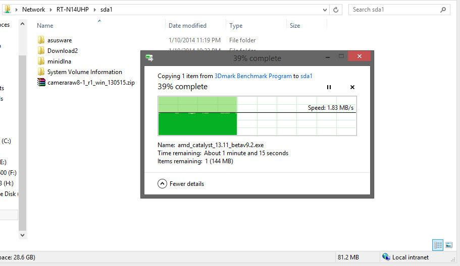 หลังจากที่เราได้ทำการตั้งค่าการใช้งานให้ ASUS RT-N14UHP สามารถแชร์ไฟล์ภายในวงแลนได้แล้ว ผมลองทดสอบโยนไฟล์เข้าไปยัง Flash Drive USB 3.0 ที่เสียบอยู่ครับ