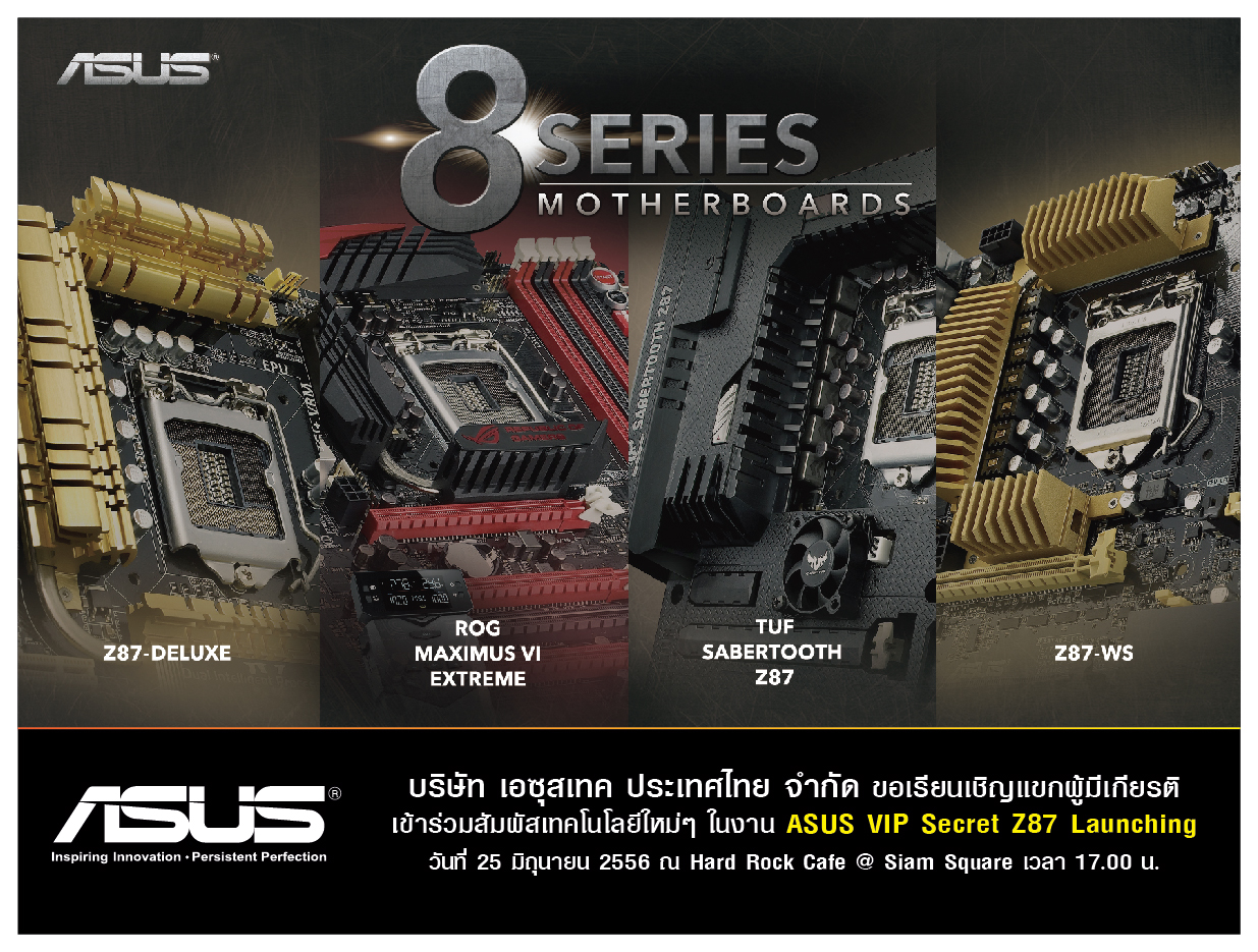 …..สวัสดีครับวันนี้พาออก Events อีกแล้วครับกับงาน ASUS Secret VIP Party Z87 Launching เป็นงานแถลงข่าวเปิดตัวมาเธอร์บอร์ดชิพเซ็ทใหม่ล่าสุด Z87 ของ ASUS นั้นเองครับ ได้หมายเชิญแบบนี้แล้ว ช้าไม่ได้ต้องรีบแล้วครับ ซาร์จแบต เครียร์เมมโมรี่การ์ด ไปลุยกันเลยดีกว่าครับ