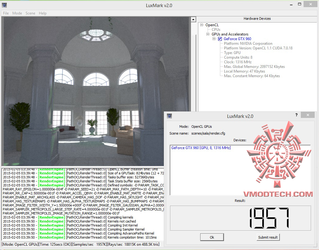 LuxMark โปรแกรมเทสด้าน Open CL ก็แรงเลยครับอยู่ที่ 2052คะแนน ดูเป็นแนวทางกันนะครับ การ์ดเขียวไม่ได้เน้น CL เท่าใดนักนะครับ