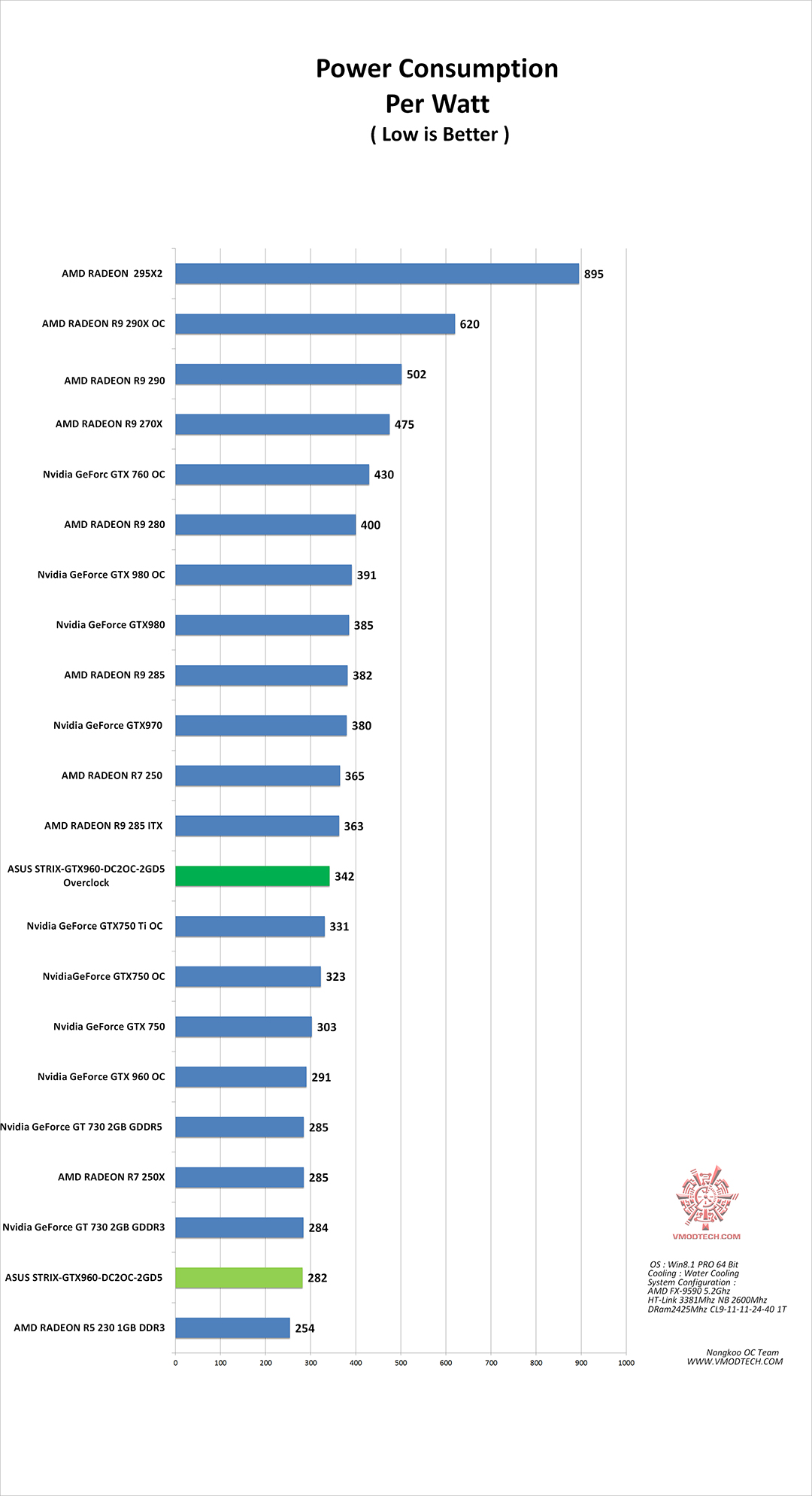 อัตราการ บริโภคไฟก็ถือต่ำมากๆกับการ์ดจอในระดับกลางไปหาสูงที่ใช้งานกันแบบ ต่อไฟเลี้ยง 6พิน 1ช่องเท่านั้น ด้วยในสถานะเดิมๆกินไฟที่ 282วัตต์ ส่วนสถานะโอเวอร์คล๊อกกินไฟแค่ 342ตต์ในการเทส Furmark โดยระบบที่ใช้ทดสอบด้วยซีพียู FX-9590 ที่มีค่า TDP 220W และยังอัดกันไปที่ 5.2Ghz ถือว่าประหยัดมากๆครับกับกราฟฟิกการ์ดในระดับกลางไปหาสูงที่กินไฟต่ำจริงๆ เหาะกับเกมส์เมอร์ขาแรงที่เน้นประหยัดไฟจริงๆ