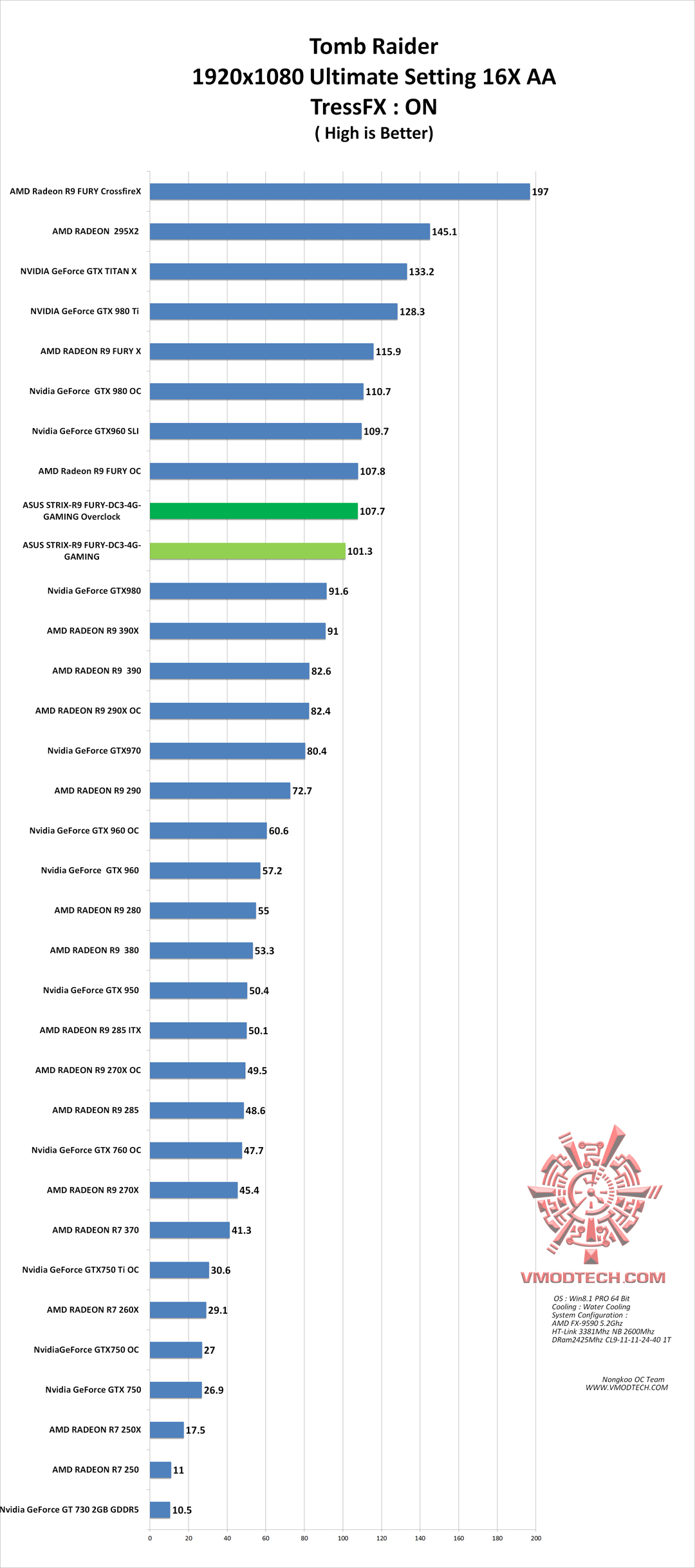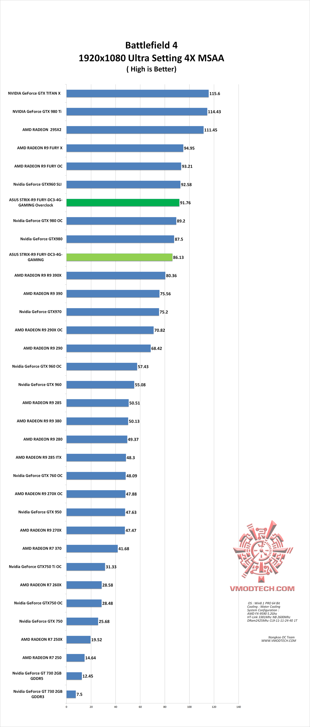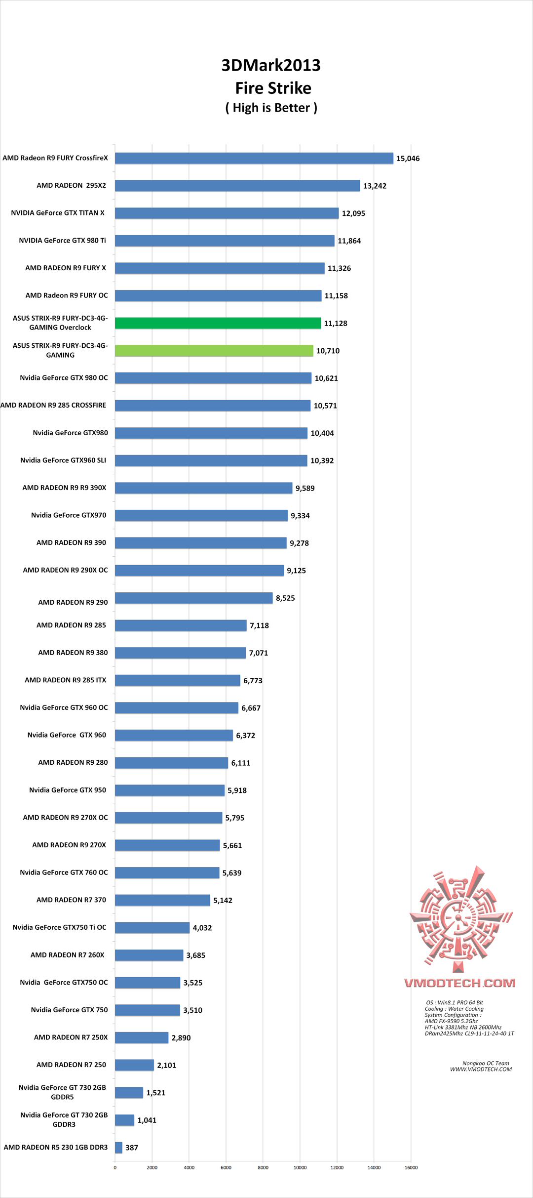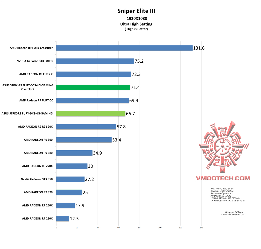 ก็มาถึงช่วงท้ายกันครับสำหรับการทดสอบ ASUS STRIX-R9 FURY-DC3-4G-GAMING ที่ วันนี้สร้างประสิทธิภาพออกมาได้ในระดับ Hi End กันจริงๆ ด้วยฟีเจอร์ที่มากมายที่ออกแบบมาสำหรับบรรดาเกมส์เมอร์ขาแรง ทั้งวัสดุอุปกรณ์ที่ออกแบบมาอย่างทนทานต่อการใช้งานที่ทาง ASUS เน้นเป็นพิเศษรวมไปถึงรูปลักษณ์ที่สวยงามคงเอกลักษณ์ของ ASUS STRIX ได้เป็นอย่างดีครับไม่ว่าจะเป็นระบบระบายความร้อนชั้นเยี่ยมอย่าง DirectCU III ที่ทำผลงานออกมาได้ดีเยี่ยมจริงๆในเรื่องของความร้อนที่ไม่เป็นปัญหาแน่นอนครับอีกทั้งเสียงรบกวนนั้นแทบไม่มีเลยจริงๆ มาดูในส่วนของประสิทธิภาพด้าน 3D และ Gaming ก็ทำผลงานออกมาได้ดีครับเล่นกันได้อย่างลื่นไหลทุกเกมส์ทั้งในปัจจุบันและบรรดาเกมส์ที่กินสเปคมากๆ ASUS STRIX-R9 FURY-DC3-4G-GAMING เอาอยู่ทุกเกมส์แน่นอนครับ ด้วยเทคโนโลยีใหม่ของ AMD อย่าง HBM ทำให้อัตราการบริโภคไฟที่ต่ำลงแต่ประสิทธิภาพการทำงานที่แรงขึ้น ผมมองว่าน่าจะเหมาะกับเกมส์เมอร์ที่ชื่นชอบความแรงความสวยงามรวมไปถึงความทนทานที่ทาง ASUS จัดให้แบบเต็มๆกับ ASUS STRIX-R9 FURY-DC3-4G-GAMING คงเป็นตัวเลือกที่คุ้มค่าเป็นอย่างมากเลยทีเดียวครับ สำหรับราคาวางจำหน่ายในประเทศไทยอยู่ประมาณที่ 2XXXXบาท สำหรับ ในวันนี้กระผมก็ขอตัวลาไปก่อน พบกันใหม่เร็วๆนี้กับรีวิวอุปกรณ์ใหม่ๆจัดเต็มทุกการทดสอบที่ Vmodtech.com สวัสดีครับ