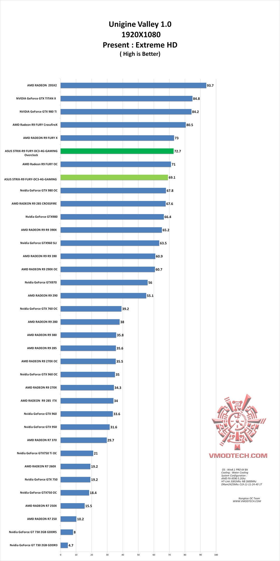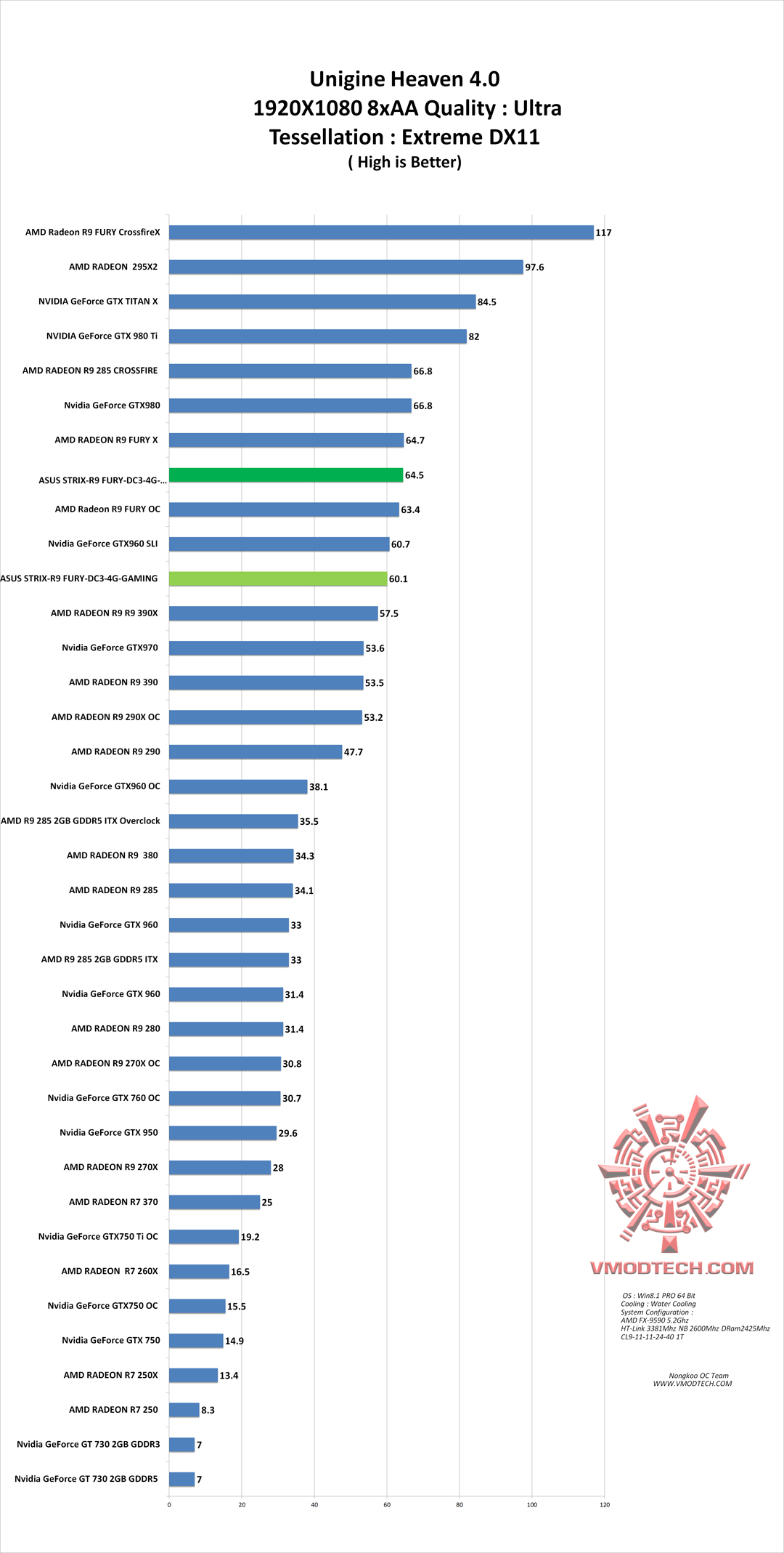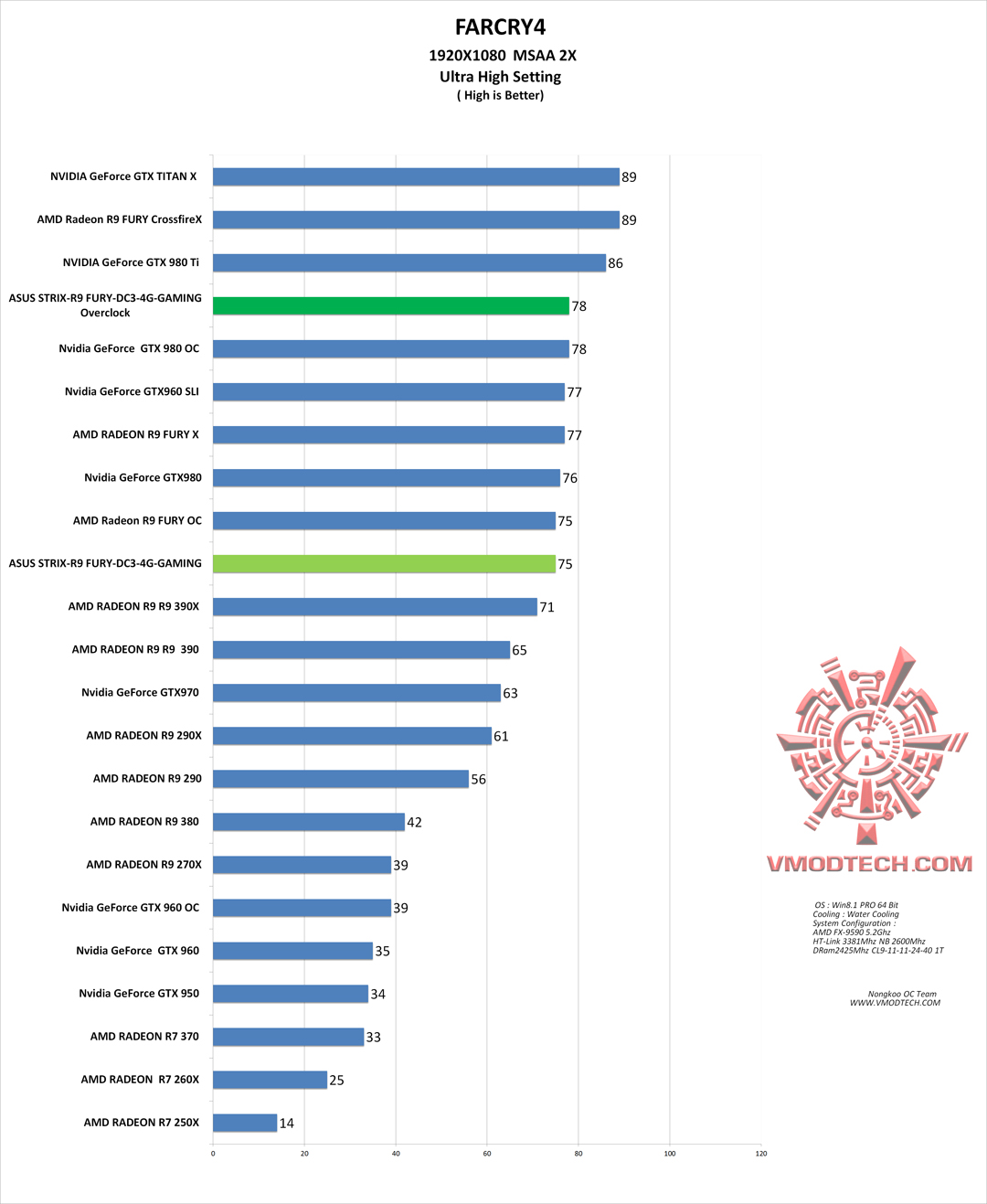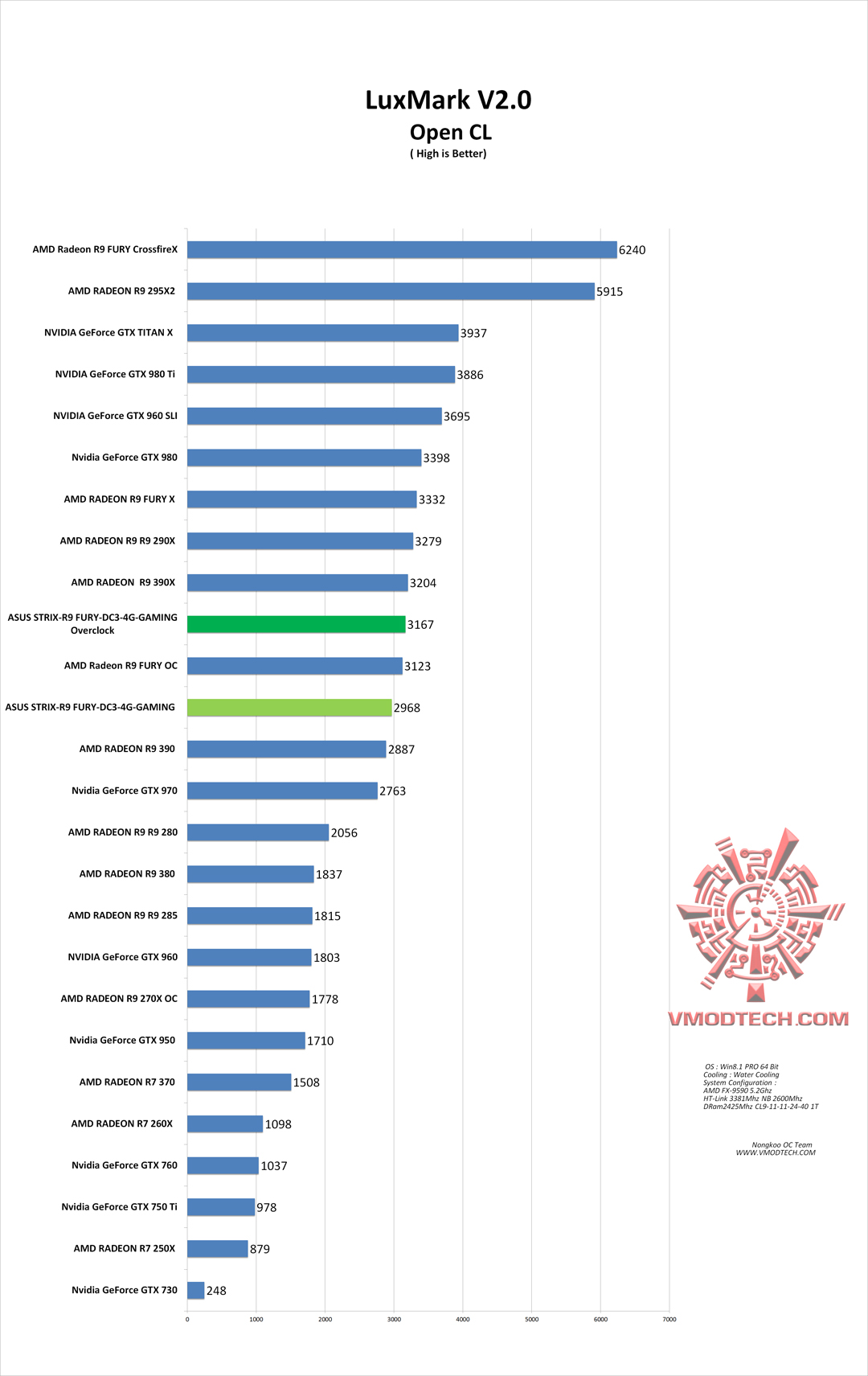 ก็มาถึงช่วงท้ายกันครับสำหรับการทดสอบ ASUS STRIX-R9 FURY-DC3-4G-GAMING ที่ วันนี้สร้างประสิทธิภาพออกมาได้ในระดับ Hi End กันจริงๆ ด้วยฟีเจอร์ที่มากมายที่ออกแบบมาสำหรับบรรดาเกมส์เมอร์ขาแรง ทั้งวัสดุอุปกรณ์ที่ออกแบบมาอย่างทนทานต่อการใช้งานที่ทาง ASUS เน้นเป็นพิเศษรวมไปถึงรูปลักษณ์ที่สวยงามคงเอกลักษณ์ของ ASUS STRIX ได้เป็นอย่างดีครับไม่ว่าจะเป็นระบบระบายความร้อนชั้นเยี่ยมอย่าง DirectCU III ที่ทำผลงานออกมาได้ดีเยี่ยมจริงๆในเรื่องของความร้อนที่ไม่เป็นปัญหาแน่นอนครับอีกทั้งเสียงรบกวนนั้นแทบไม่มีเลยจริงๆ มาดูในส่วนของประสิทธิภาพด้าน 3D และ Gaming ก็ทำผลงานออกมาได้ดีครับเล่นกันได้อย่างลื่นไหลทุกเกมส์ทั้งในปัจจุบันและบรรดาเกมส์ที่กินสเปคมากๆ ASUS STRIX-R9 FURY-DC3-4G-GAMING เอาอยู่ทุกเกมส์แน่นอนครับ ด้วยเทคโนโลยีใหม่ของ AMD อย่าง HBM ทำให้อัตราการบริโภคไฟที่ต่ำลงแต่ประสิทธิภาพการทำงานที่แรงขึ้น ผมมองว่าน่าจะเหมาะกับเกมส์เมอร์ที่ชื่นชอบความแรงความสวยงามรวมไปถึงความทนทานที่ทาง ASUS จัดให้แบบเต็มๆกับ ASUS STRIX-R9 FURY-DC3-4G-GAMING คงเป็นตัวเลือกที่คุ้มค่าเป็นอย่างมากเลยทีเดียวครับ สำหรับราคาวางจำหน่ายในประเทศไทยอยู่ประมาณที่ 2XXXXบาท สำหรับ ในวันนี้กระผมก็ขอตัวลาไปก่อน พบกันใหม่เร็วๆนี้กับรีวิวอุปกรณ์ใหม่ๆจัดเต็มทุกการทดสอบที่ Vmodtech.com สวัสดีครับ