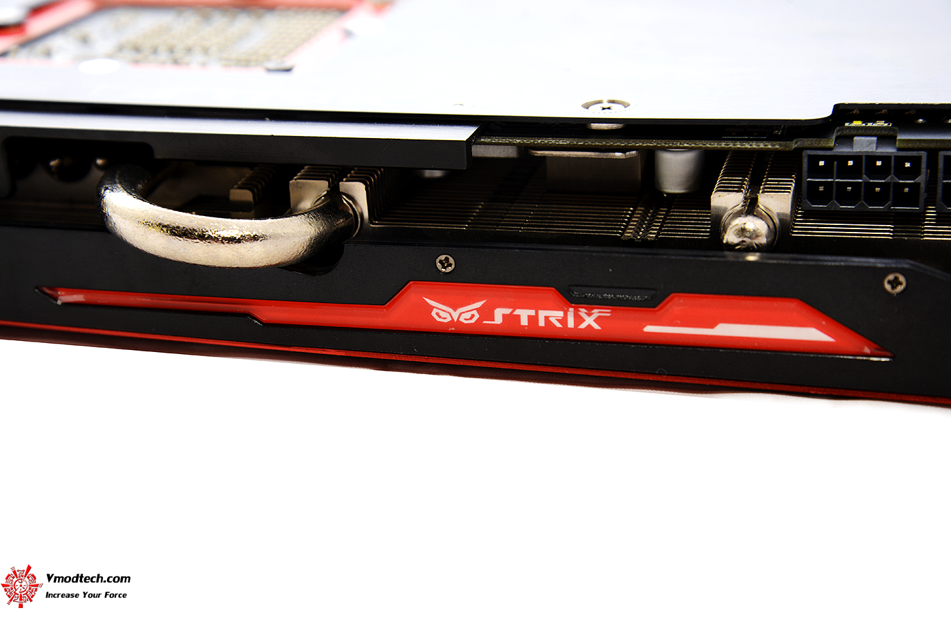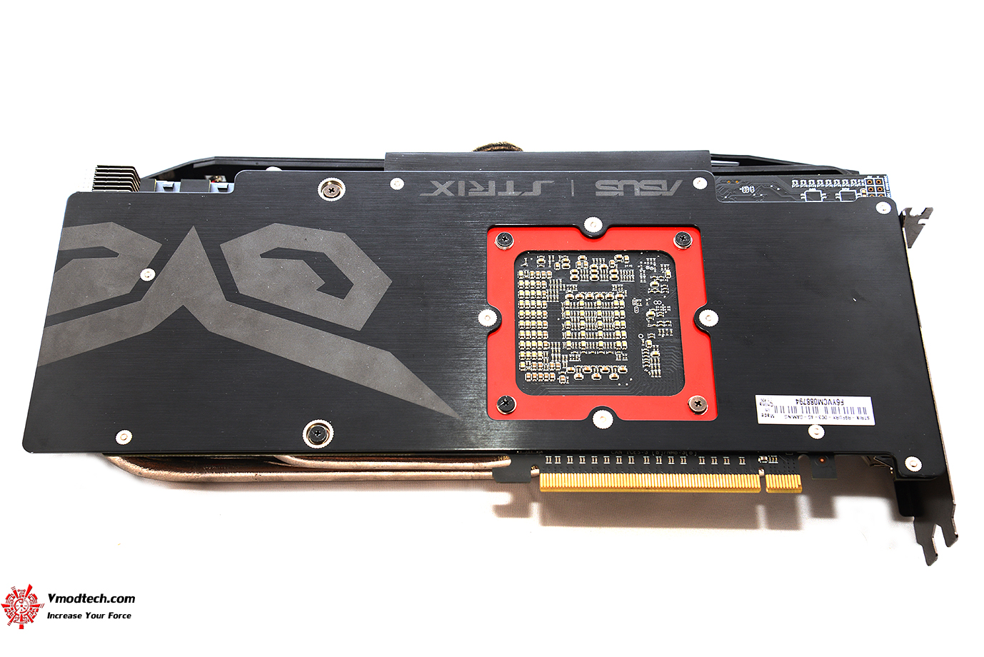PCB ตัวการ์ดสีดำสนิท พร้อมทั้งมีแผ่นแพลตรองรับอย่างดี ในส่วนของสีแดงก็คือ STRIX GPU-FORTIFIER ที่ช่วยป้องกัน GPU อีกชั้นครับ