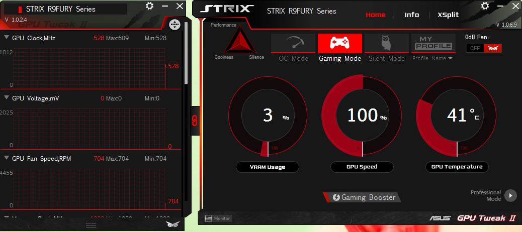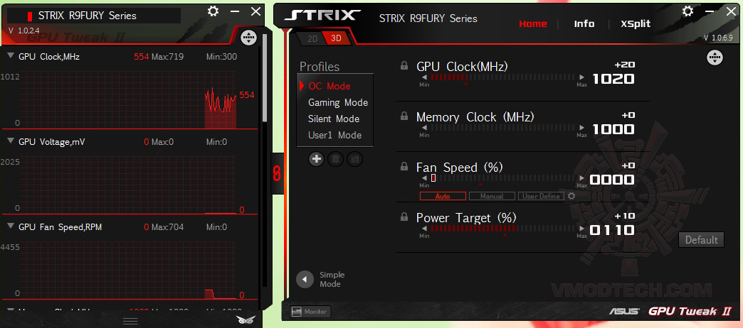 หน้าตาของ ASUS GPU Tweak II นั้นจะมีเมนูการทำงานให้เราเลือกใช้งานได้ 3ระดับ OC Mode , Gaming Mode , Silent Mode ซึ่งเราสามารถเลือกใช้งานได้เลยครับว่าจะต้องการแบบไหน พร้อมทั้งสถานะการทำงานของตัวการ์ดไม่ว่าจะเป็นรอบพัดลม อัตราการบริโภคไฟต่างๆ ความเร็วของการ์ดจอ