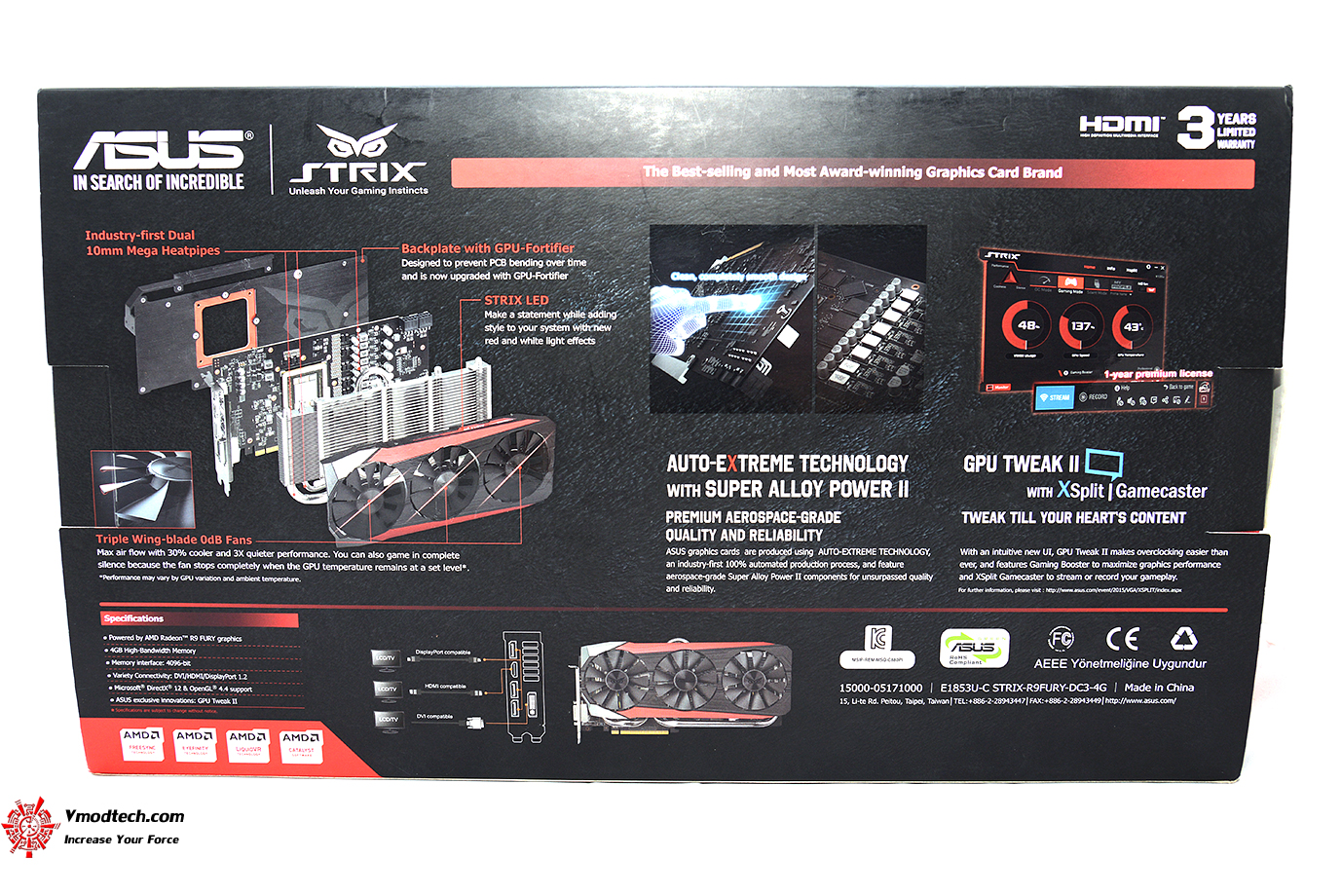 สวัสดีครับทุกๆท่านที่เยี่ยมชมเว็บไซต์ Vmodtech.com วันนี้เรามาชมกราฟฟิกการ์ดในซีรี่ย์ใหม่ของทาง AMD กันอย่างต่อเนื่องเลยครับกับกระแสกราฟฟิกการ์ดเทคโนโลยีใหม่อย่าง AMD RADEON FURY ที่นำเอาเทคโนโลยี HBM เข้ามาใช้ใหม่ทั้งหมด ซึ่งวันนี้มากันในแบรนด์ดังอย่าง ASUS ในชื่อรุ่นเต็มๆว่า ASUS STRIX-R9 FURY-DC3-4G-GAMING ที่ออกแบบมาได้อย่างสวยงามลงตัวเป็นอย่างยิ่งอีกทั้งประสิทธิภาพความแรงระดับ Hi End รวมทั้งการออกแบบที่ถือได้ว่าจัดเต็มจริงๆไม่ว่าจะเป็นตัวฮีตซิงค์ระบายความร้อนตามแบบฉบับ STRIX ซีรี่ย์ที่มีวัสดุอุปกรณ์ป้องกันอันตรายจากการกระแทกรอบๆตัวการ์ดกันเลยทีเดียวครับ เรียกได้ว่าเป็นการ์ดจอสำหรับเกมส์เมอร์และยังแข็งแกร่งทนทานต่อการใช้งานเป็นพิเศษอีกด้วย เดี๋ยวเราไปชมกันครับว่าประสิทธิภาพการทำงานจะออกมาในรูปแบบไหน เอาเป็นว่าเราไปดูรายละเอียดคร่าวๆก่อนจะไปชมผลทดสอบกันต่อเลยครับ