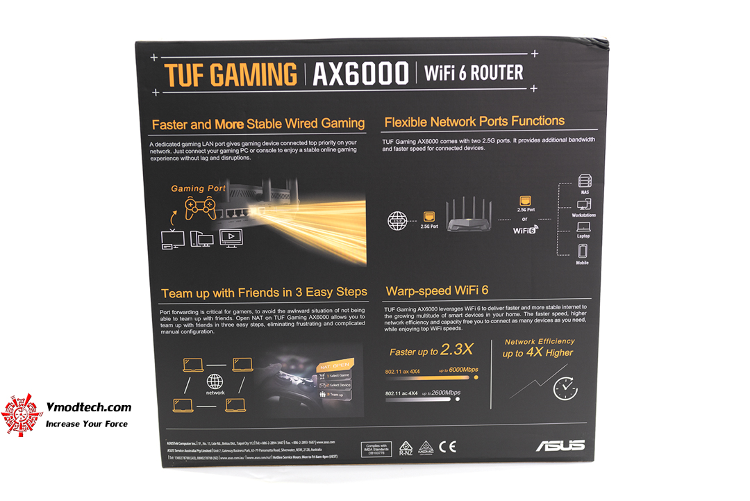กล่องบรรจุ TUF Gaming AX6000 นั้นมีขนาดปานกลางค่อนไปทางใหญ่ ที่ด้านหลังกล่องนั้นมีรายละเอียดของตัวเราเตอร์แสดงไว้อย่างชัดเจน