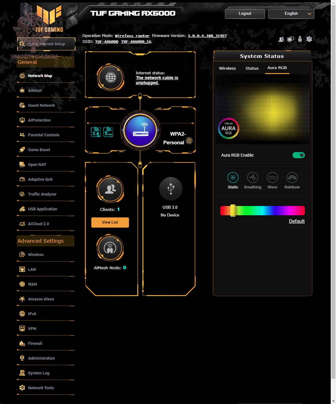 เรื่องแสงสี ที่หน้าหลักของ Network Map นั้น ด้านขวามือจะมีตัวเลือกให้เราสามารถปรับแสงสีและเอฟเฟกการกระพริบตัวโลโก้ TUF บนตัวเราเตอร์ได้นะครับ