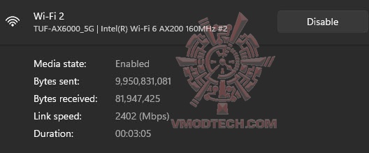 ผมยังคงเทสเฉพาะความเร็วในการส่งผ่านข้อมูลทางย่าน 5 GHz เหมือนเดิมนะครับเพื่อหาว่าความเร็วนั้นสูงสุดอยู่ที่เท่าไหร่ โดยวันนี้ตัวอแดปเตอร์ WiFi ผมสามารถจับกับ TUF Gaming AX6000 ได้ที่ความเร็ว 2402 Mbps