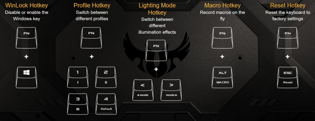 การปรับแต่งเอฟเฟกของ TUF K5 นั้นสามารถทำได้ง่ายๆผ่านทางปุ่มฟังก์ชันและปุ่มประกอบตามตัวอย่างด้านล่างนี้นะครับ