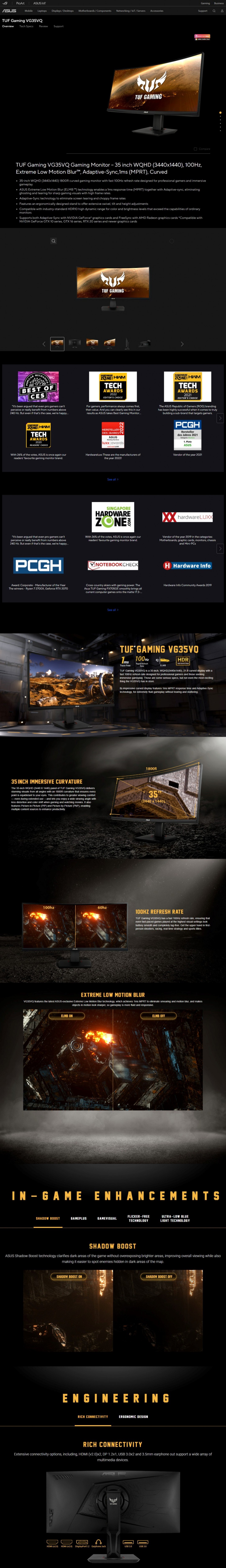 สวัสดีครับ วันนี้เรามีจออีกรุ่นจากแบรนด์ ASUS มารีวิวกันอีกเช่นเคยครับรุ่นที่เราจะพูดถึงในวันนี้เป็นเกมส์มิ่งมอนิเตอร์ คือออกแบบมาเพื่อนักเล่นเกมส์โดยเฉพาะเลยครับ ASUS TUF Gaming VG35VQ Gaming Monitor ซึ่งเป็นจอโค้งขนาด 1800R โดยตัวจอนั้นเป็นจอ LED มอนิเนอร์ที่มีความละเอียด 3440 × 1440 หรือ WQHD ตัวพาแนลเป็นแบบ VA ที่สามารถให้ความสว่างและคอนทราสที่ดี อัตราส่วนจออยู่ที่ 21:9 มีขนาด 35 นิ้ว และรีเฟรชเรทที่ 100 Hz ตัวจอนี้นั้นตอบสนอง Color Space (sRGB) : 100% ตามสเปกที่ตอบสนองได้นี้ถือเป็นตัวที่สุดด้านการเล่นเกมส์นะครับ และยังรวมถึงรองรับ HDR10 ด้วย เอาเป็นว่าเรามาชมรายละเอียดต่างๆกันต่อเลย