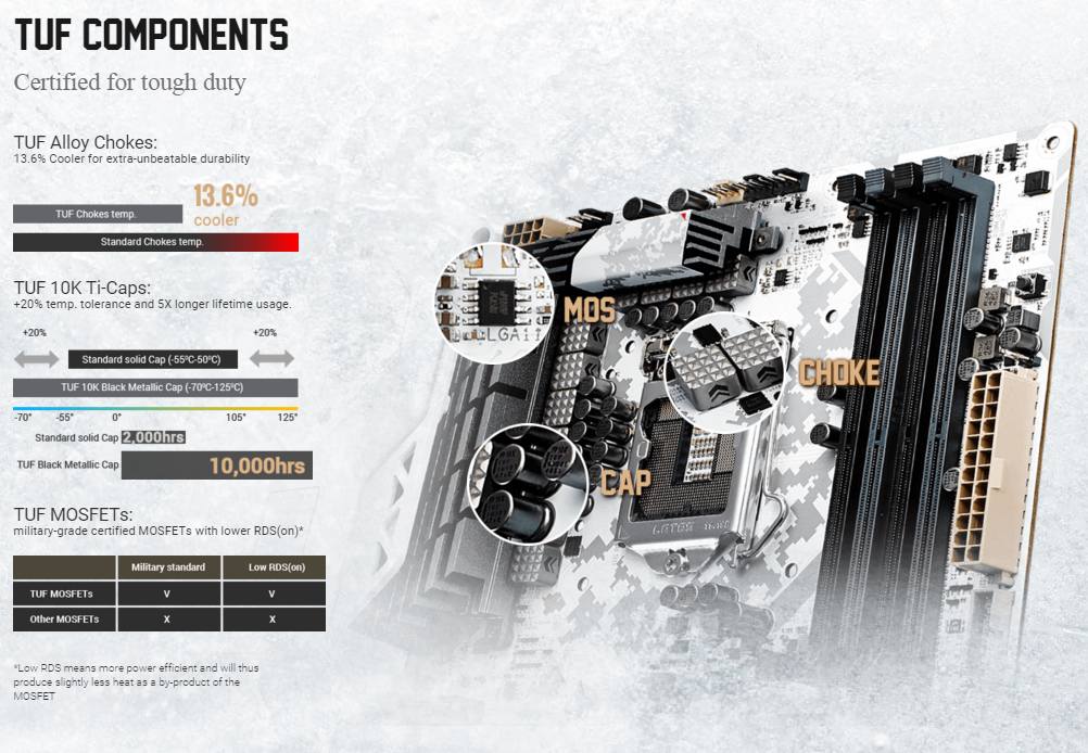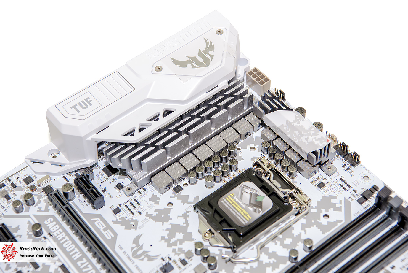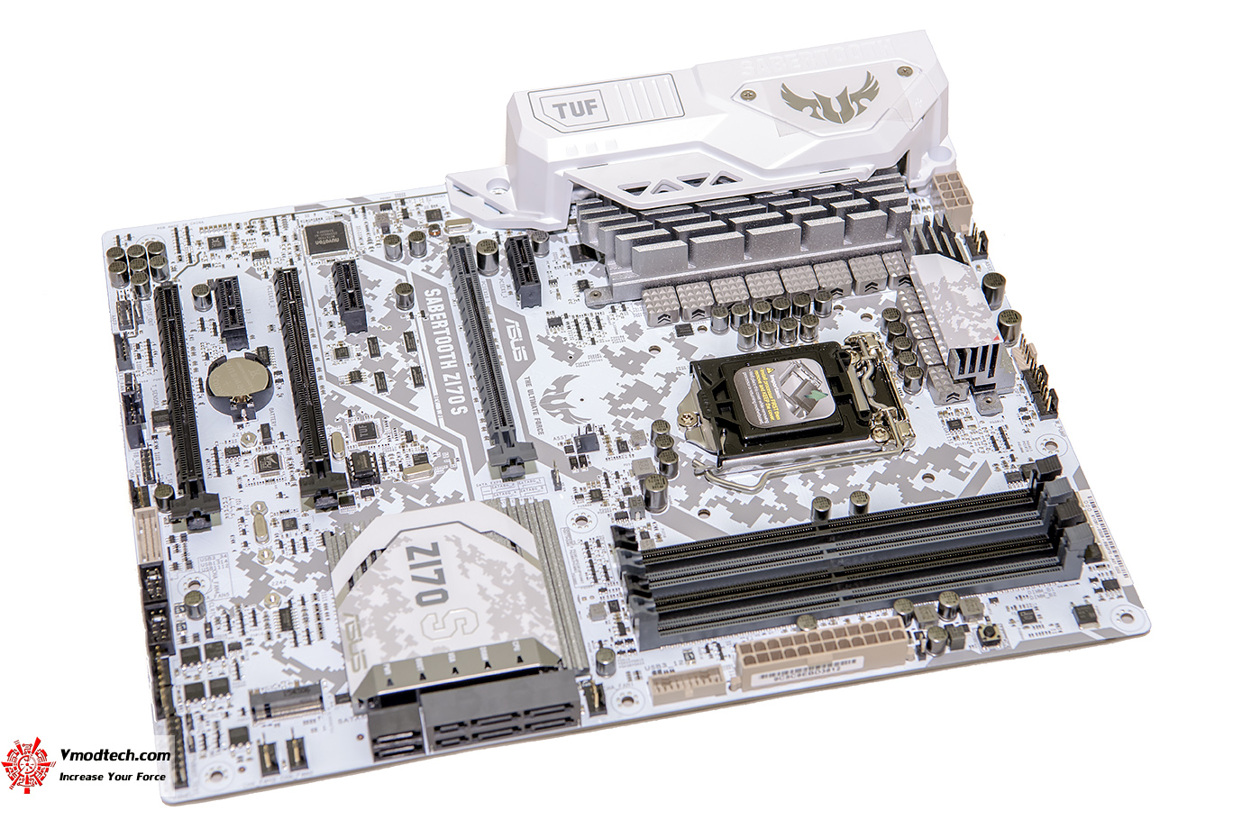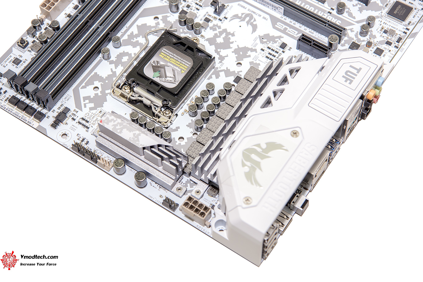 หน้าตาของมาเธอร์บอร์ดรุ่นนี้ จะออกแนวเข้มขรึมเทาลายพรางคาดขาว ตามคอนเซปต์ใหม่ของบอร์ดในตระกูล ASUS TUF ครับ