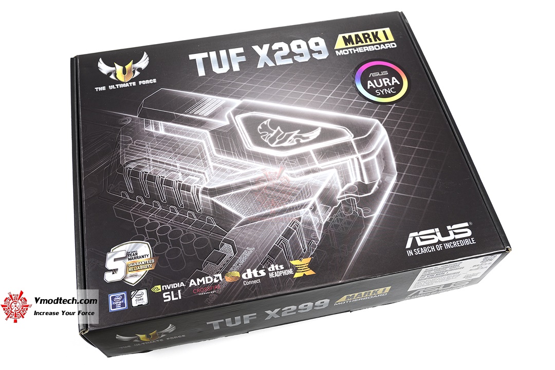 กล่องบรรจุ ASUS TUF X299 Mark 1 นั้น จะมีขนาดไม่ใหญ่นะครับแต่ก็มีน้ำหนักพอตัว ทั้งด้านหล้าและด้านหลังกล่องมีการนำเสนอรายละเอียดของบอร์ดเอาไว้เยอะและครอบคลุมคุณสมบัติเด่นของบอร์ด ASUS TUF X299 Mark 1 นี้อย่างครบถ้วน