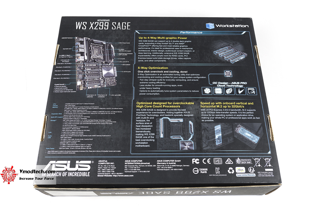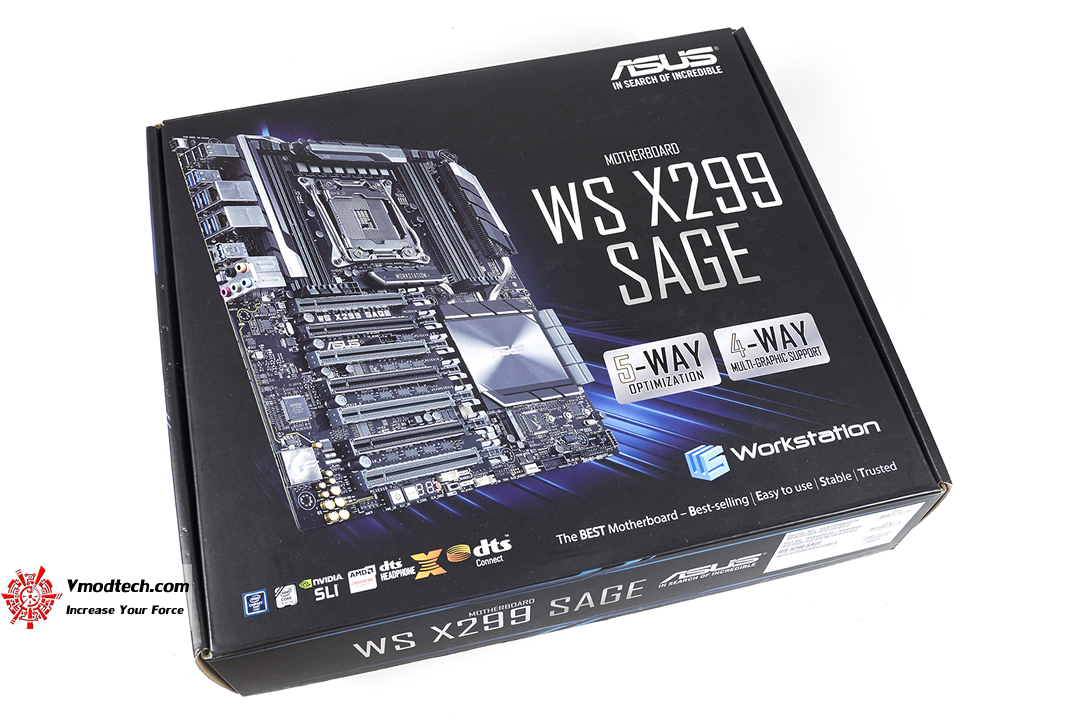 กล่องบรรจุ ASUS WS X299 SAGE นั้นจะมีขนาดกลางค่อนไปทางใหญ่ตามขนาดมาเธอร์บอร์ด สีสรรออกแบบมาด้วยโทนสีน้ำเงินตัดกับสีดำ ด้านหลังก็จะมีรายละเอียดสำคัญๆของบอร์ดอธิบายมาให้เข้าใจกันครับ