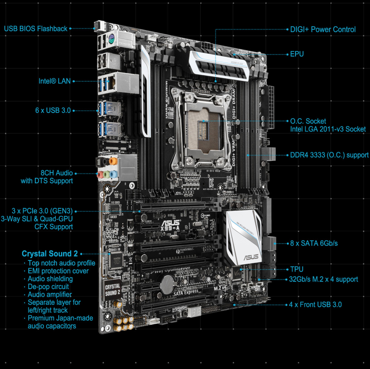 ถึงแม้ว่าเจ้า ASUS X99-A นั้นจะถูกวางตัวมาเป็นเมนบอร์ดราคาไม่สูงนักบนพื้นฐาน 2011-3 แต่ทว่าคุณสมบัติที่อัดแน่นอยู่บนบอร์ดนั้นไม่ได้ต่างจากบอร์ด Performance Flagship อย่าง Rampage V Extreme เลย