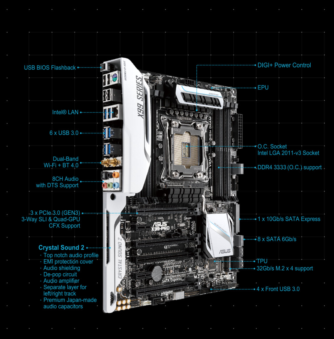 ถึงแม้ว่าเจ้า ASUS X99-Prp นั้นจะถูกวางตัวมาเป็นเมนบอร์ดราคาไม่สูงนักบนพื้นฐาน 2011-3 แต่ทว่าคุณสมบัติที่อัดแน่นอยู่บนบอร์ดนั้นไม่ได้ต่างจากบอร์ด Performance Flagship อย่าง Rampage V Extreme เลย