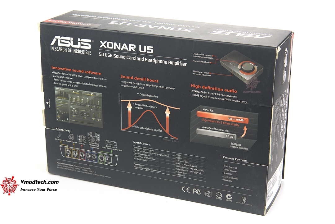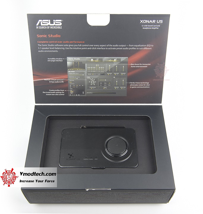 กล่องบรรจุนั้นออกแบบได้จี๊ดจ๊าดทีเดียวตามสโลแกนเกมส์มิ่งของมัน คุณสมบัติหลักๆของตัว ASUS XONAR U5 นั้นได้มีแสดงไว้บนกล่องเพื่อให้เลือกหาไม่ผิดวัตถุประสงค์การใช้งาน