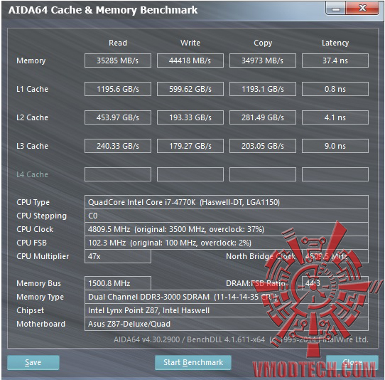 ลองเทสความแรงของ Memory ที่ความเร็ว 5Ghz ดูสักนิดครับ ก็ไม่ขยับขึ้นมาเท่าใดครับกับความเร็วของซีพียูที่เพิ่มมา 5Ghz ไม่มีผลกับ memory นะครับจะมีแต่ค่า Latency ที่แรงขึ้นมาหน่อยอยู่ที่ 37.7ns
