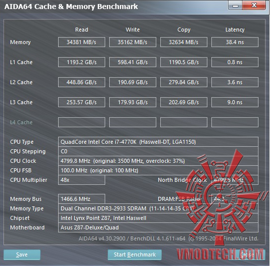 ค่า Memory Read อยู่ที่ 34381MB/s เลยทีเดียวครับกับคอนฟิกที่ผมไม่ได้กด Timing สักเท่าไหร่ก็แรงได้ดีเลยทีเดียวด้วยบัสแรม 2933Mhz ค่าCL สบายๆ