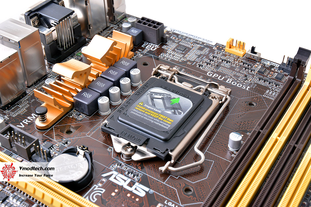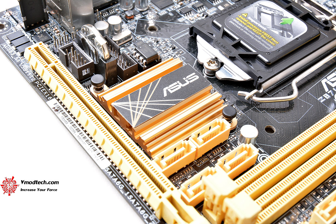 แถมออกแบบวางในแนวตั้งฉากกับตัวบอร์ดด้วย ประหยัดพื้นที่แต่ยังแรงจริงๆ แถมซิงค์ภาคจ่ายไฟสีทองงดงามกันเลยทีเดียว