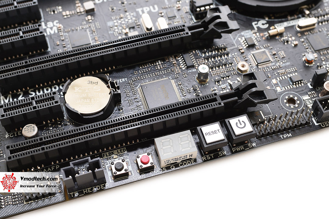 จะมีสวิทซ์ START , RESET , Clear CMOS , DEBUG LED อยู่บริเวณปลายบอร์ดนี้ด้วยนะครับ ครบเครื่องเรื่อง OC กันเลย