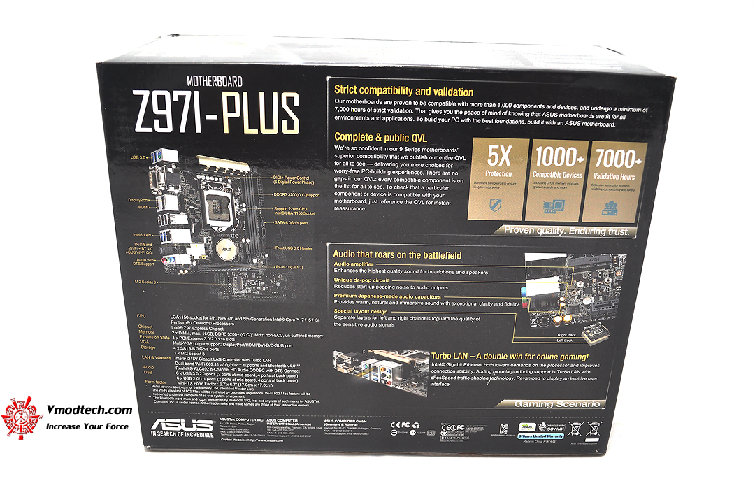 สวัสดีครับ ทุกๆท่านที่เยี่ยมชมเว็บไซต์ Vmodtech.com ในวันนี้เรามาชมรีวิวเมนบอร์ดใหม่ล่าสุดของของทาง INTEL กันครับ ซึ่งยังคงเป็นเมนบอร์ดชิบเซ็ต Z97 ในลำดับที่ 29 ที่ทาง Vmodtech.com ของเราที่ทำการรีวิวกันมาเรื่อยๆมาให้ทุกๆท่านได้ชมกันอย่างต่อเนื่องติดต่อกันเลยครับ ซึ่งในวันนี้มากันในยี่ห้อ ASUS ในชื่อรุ่น ASUS Z97I-PLUS ที่เป็นเมนบอร์ดในรุ่นเล็กๆ Mini-ITX แต่ประสิทธิภาพนั้นเทียบเท่าบรรดาเมนบอร์ด ATX กันเลยทีเดียวครับหรือเรียกง่ายๆว่าเล็กแต่ขนาดแต่ประสิทธิภาพนั้นไม่ได้เล็กลงไปเลยครับ ด้วยฟีเจอร์เด่นที่เน้นประสิทธิภาพของ 5X Protection กับระบบป้องกัน 5ประการที่ช่วยปกป้องเมนบอร์ดไม่ว่าจะเป็นระบบจ่ายไฟขั้นเทพฯอย่าง ASUS DIGI+ VRM รวมไปถึงระบบป้องกันความเสียหายของหน่วยความจำ(แรม)อย่างระบบ resettable fuses ป้องกันกระแสไฟฟ้าเกินและความเสียหายกระแสไฟฟ้าลัดวงจร อีกทั้งยังมี Cap หรือ คาปาซิเตอร์ 5K-hr solid-state นั่นก็คือคาฟาซิเตอร์ที่ผ่านการทดสอบว่าใช้งานได้ถึง 5000ชั่วโมงและทนอุณหภูมิความร้อนได้ถึง 105องศาฯกันเลยทีเดียว ที่สำคัญยังมี ESD Guards ป้องกันไฟฟ้าสถิตและพาแนลด้านหลังยังทำจาก Stainless-steel back I/O คงทนขึ้น 3 เท่า เพื่อป้องกันปัญหาคลาบอ๊อกไซด์ต่างๆที่เกิดขึ้นอีกด้วย ที่สำคัญเมนบอร์ดของ ASUS ได้ผ่านการทดสอบเข้มงวดนานกว่า 7,000 ชั่วโมง โดยการทดสอบการใช้งานหนัก การใช้งานร่วมกับอุปกรณ์ต่างๆทั้งฮาดแวร์ , ซอฟต์แวร์ และการทดสอบความปลอดภัย เพื่อยืนยันว่ามาเธอร์บอร์ดมีความแข็งแกร่งเป็นพิเศษ นี่คือฟีเจอร์เด่นๆของ ASUS Z97I-PLUS ที่เราจะทำการทดสอบกันในวันนี้ครับ เดี๋ยวเรามาชมกันครับว่าประสิทธิภาพต่างๆของเมนบอร์ดนั้นเป็นเช่นไร ก่อนอื่นเราไปชมรายละเอียดจากทางเว็บไซต์กันก่อนครับ