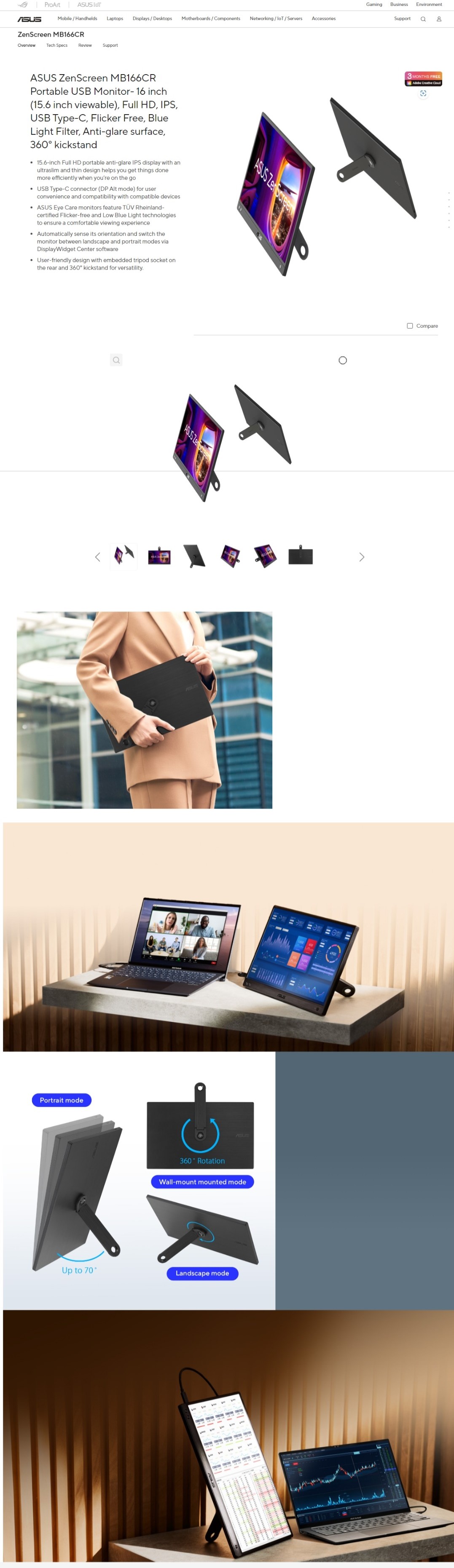 สวัสดีครับ วันนี้เรามีจอมอนิเตอร์แบบพกพารุ่นใหม่จากแบรนด์ ASUS มารีวิวครับมากมายหลายรุ่นหลายขนานเพื่อรองรับทุกความต้องการทุกความสะดวกของยูสเซอร์ จอมอนิเตอร์แบบพกพานี้จะมีประโยชน์มากครับกับคนที่ต้องการใช้งานบนจอที่มีพื้นที่ทำงานมากกว่าจอแล๊ปท๊อปหรือว่าจอของแท๊ปเบล็ท โดยตัวเลือกที่เห็นกันมากเป็นส่วนใหญ่ก็จะเป็นจอที่ไม่ใหญ่มาก พกพาสะดวก บางทีก็แค่เอาจอเสริมเสียบเข้าไปไว้กับแลปท๊อปเลย เรากำลังพูดถึงจอ ASUS ZenScreen MB166CR ครับ มันเป็นจอ LED มอนิเนอร์ที่มีความละเอียด 1920 × 1080 หรือ Full HD ตัวพาแนลเป็น IPS ผิวหน้าไร้การสะท้อนแสง ที่สามารถให้ความสว่างและคอนทราสที่ดีพร้อมกับมุมมองที่กว้างถึง 178 องศา อัตราส่วนจออยู่ที่ 16:9 มีขนาด 15.6 นิ้ว และมีรีเฟรชเรทที่ 60 Hz น้ำหนักประมาณ 780 กรัม