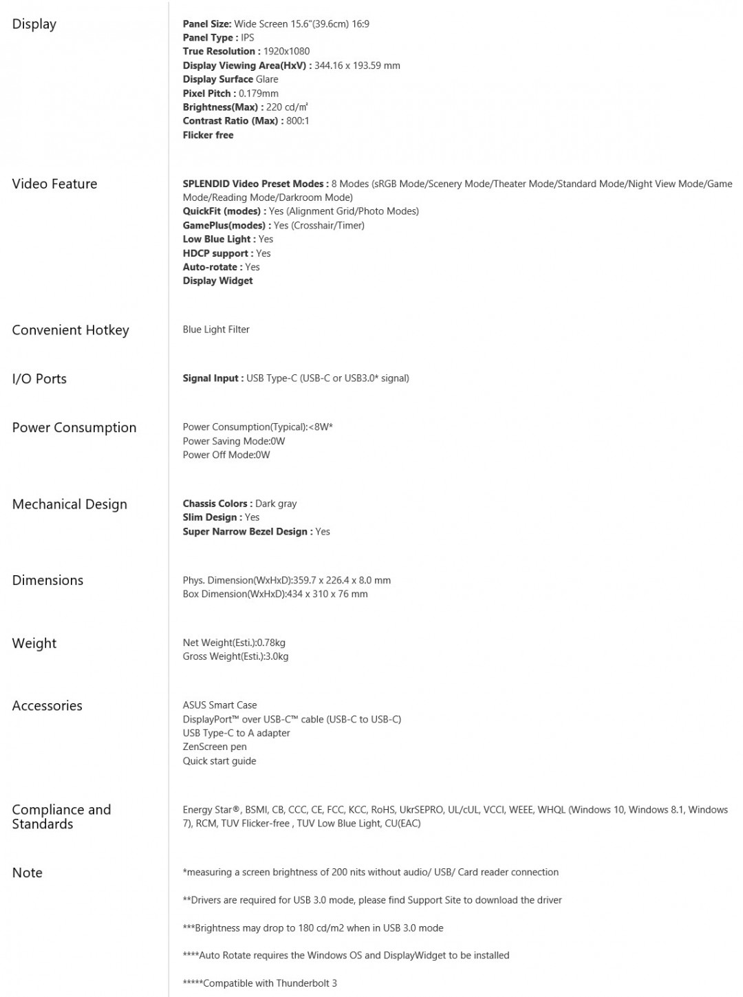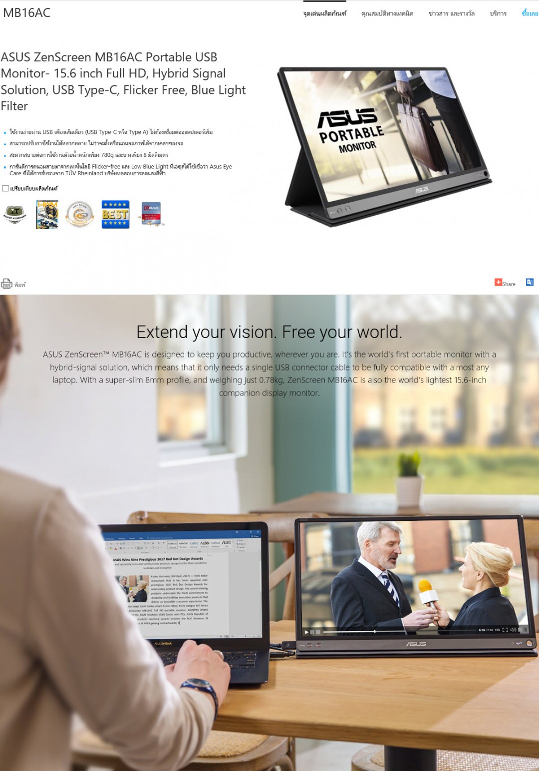 สำหรับ ASUS ZenScreen MB16AC นั้นเป็นจอที่มีขนาด 15.6 นิ้ว ไม่เล็กไม่ใหญ่ครับ เชื่อมต่อได้ง่ายๆผ่านทางพอร์ท USB Type-C แต่ก็มีอแด๊ปเตอร์ Type-A แบบปกติแถมมาให้ด้วยนะครับ พาแนลนั้นเป็น IPS ที่มีความละเอียดที่ระดับ Full HD หรือ 1920 x 1080 หน้าจอแบบ Glare ที่ให้สีสรรสดใส น้ำหนักไม่มากครับเพียง 780 กรัม มีความหนาไม่ถึงเซนติเมตรครับเพียง 8 มิลลิเมตรเท่านั้น และแน่นอนว่ามีเทคโนโลยีถนอมสายตา Flicker free และ Low blue light ที่ทาง Asus เรียกมันว่า ASUS Eye Care ที่จะช่วยลดแสงสีฟ้าให้ถนอมสายตาเรา