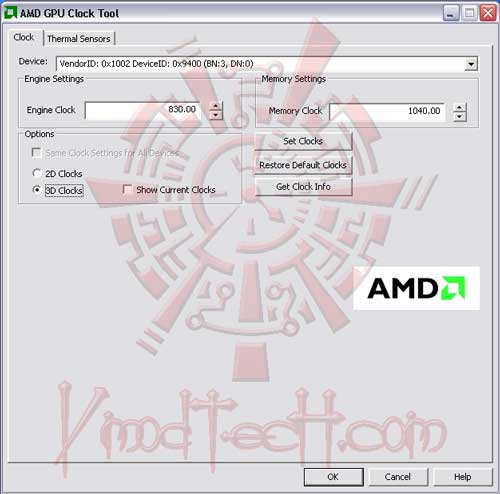 และอีกปัญหาที่ผมพบก็คือตรงสายไฟ8พินผมเสียบแค่6พินทำให้ฟังค์ชันOverdriveของตัวControlCenterในไดรเวอร์ของATIไม่ทำงานครับ ซึ่งก็ไม่เป็นไรครับ ผมก็เลยใช้โปรแกรม AMD GPU Clock Tool ในการOverclockแทน ซึ่งโปรแกรมนี้ หาโหลดได้ที่ Techpowerup.com ครับ ในรูปที่เห็นคือค่าความเร็วCore/Memขณะทำงานที่2Dนะครับ โดยจะมีความเร็วที่506.25/513MHz ตรงนี้อย่าไปลากเล่นนะครับ ลากนิดเดียวก็จอมืดเลยครับ ผมลองมาแล้ว