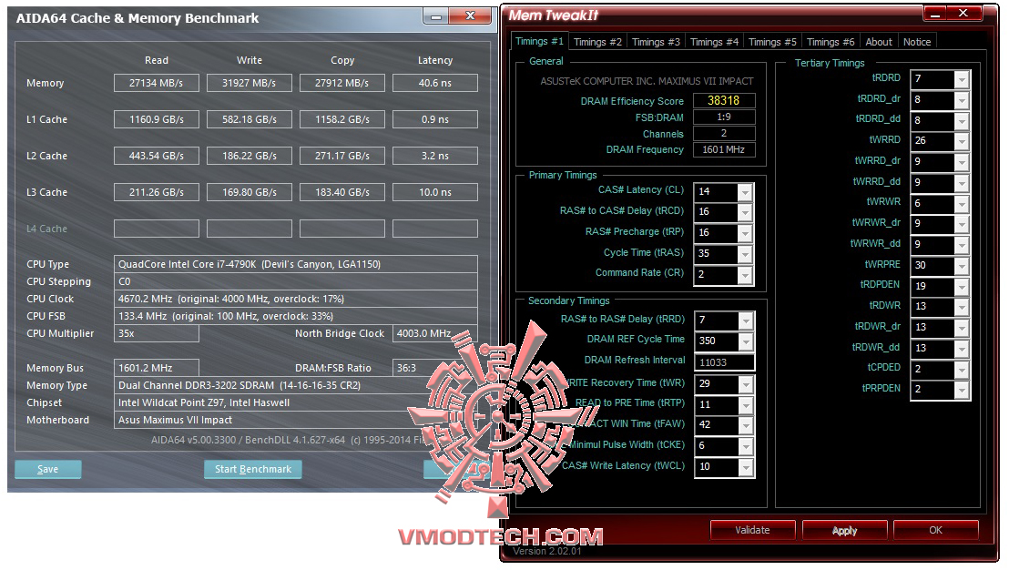 ค่า Memory Read, Write ก็ทำออกมาได้ดีครับอยู่ที่ Read 27134MB/s และ Write 31927MB/s โดยผมกด Timing ไปที่ TRDRD 7/TWRWR 6 ครับ