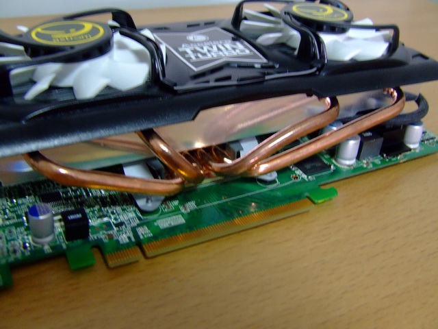 แกะกล่องออกมาดูหน้าตาการ์ดหน่อย อูย พัดลมคู่ซะด้วย ระบบระบายความร้อนเป็นแบบ ท่อทองแดง 4 เส้นผ่านมายังตะแกรงอีกที อืม เย็นแน่ๆแบบนี้