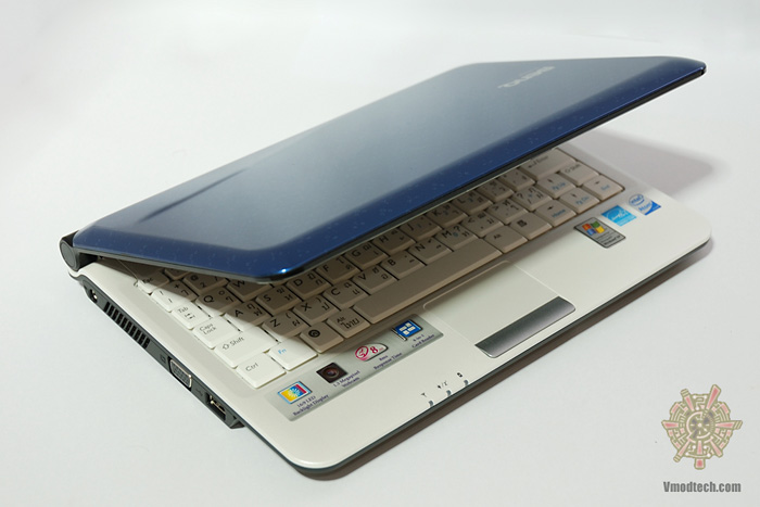 เปิดฝาออกมา พบว่าจอขนาด 10.1 นิ้วนั้นเป็น 16:9 format ความกว้าง 1024pixel ครับ เพียงพอสำหรับการใช้งานอินเตอร์เน็ททั่วไปแน่นอน ดีไซน์ส่วนใหญ่ ยังคงเหมือนๆกับ Netbook ทั่วไปอยู่ครับ
