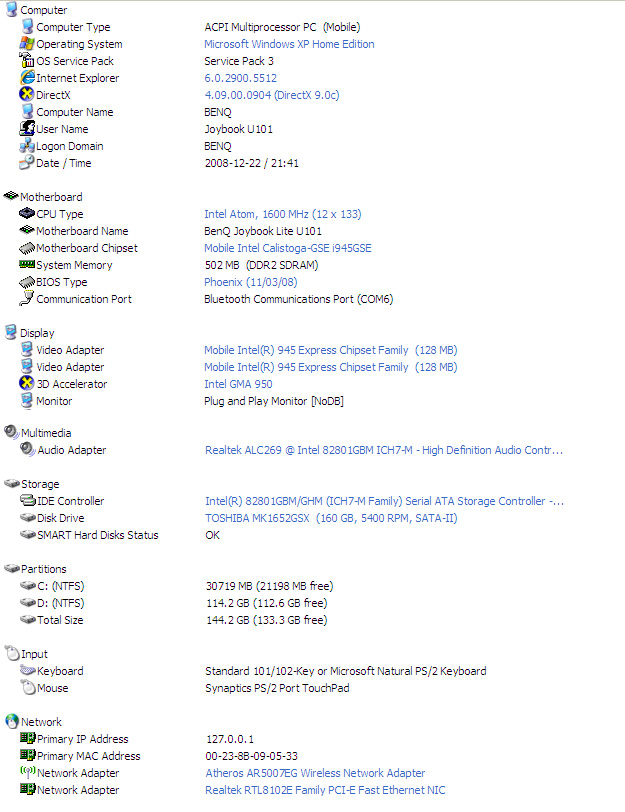 ภาพจากโปรแกรม Everest แสดงรายละเอียดของเครื่อง เป็นไปตามปกติของ netbook ทั่วๆไปครับ