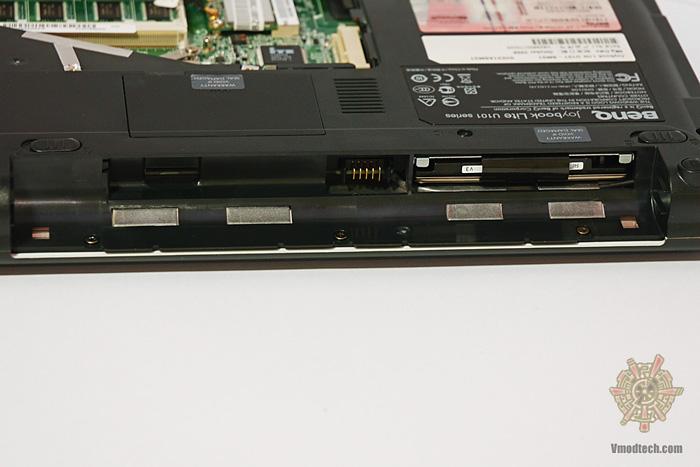 พอถอดแบตเตอร์รี่ออกมา ก็จะพบกับช่องในซิมการ์ด ซึ่งต้องไปหาอะแอปเตอร์ HSPA modem มาติดตั้งเพื่อให้ใช้งานอินเตอร์เน็ทผ่านซิมโทรศัพท์ได้อีกทีนึงครับ ส่วนช่องใส่ HDD ก็ทำออกมาได้น่าสนใจดีครับ ดังรูป จะเห็นว่า มี ที่ดึง HDD ซ่อนอยู่ตรงบริเวณช่องแบตเตอร์รี่