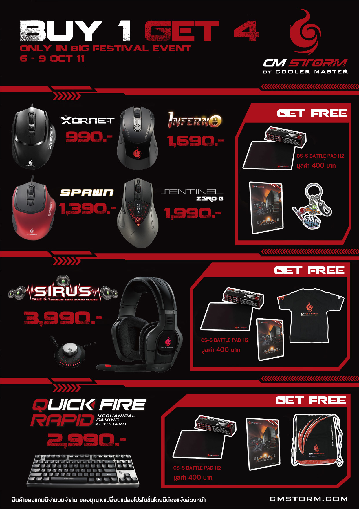 2. ซื้อสินค้าของ CM Storm สามชนิด (เม้าส์รุ่นใดก็ได้ + คีย์บอร์ด Quik Fire Rapid+ หูฟัง Sirus True 5.1) ลดไปเลยทันที1,500 บาท พร้อมรับฟรี!!!แผ่นรองเม้าส์ CS-S BATTLE PAD HD มูลค่า 400 บาทและซื้อยืดเท่ห์ๆ จาก CM Storm